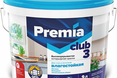 Влагостойкая акриловая краска для стен и потолков PREMIA CLUB 3 - лучший выбор для тех, кто любит удобство и комфорт. Она легко наносится на подготовленную поверхность, образуя матовое покрытие, стойкое к воде, пару и конденсату, поэтому может использоваться как в сухих помещениях, так и в помещениях с повышенной влажностью (кухни, ванные комнаты, и.т.д).