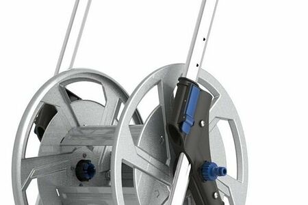 Тележка для шланга выполнена из металла, в серебристом оттенке. Металлическая конструкция отличается прекрасными прочностными и износостойкими характеристиками. У данной модели предусмотрено два колеса и ручка для комфортного перемещения тележки по периметру, а также катушка и специальная подставка, которая обеспечивает устойчивость конструкции. Материал изготовления устойчив к механическим повреждениям и коррозии.
