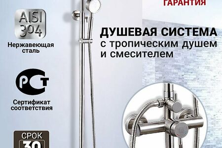 Душевая система с тропическим душем - это сочетание непревзойденного дизайна, высокой функциональности и комфорта. Штанга для душа выполнена из нержавеющей стали AISI-304, что делает ее прочной, устойчивой к коррозии и безопасной для здоровья. Душевая система включает в себя смеситель, тропический душ и душевую лейку. Ручной душ с микроперфорацией, создает интенсивный поток из мельчайших частиц с косметическим массажным эффектом. Душевая штанга регулируется по высоте от 90 до 125см. Благодаря телескопической стойке, верхний душ легко настраивается под высоту каждого члена семьи. Комплектуется усиленным эксцентриком с шумопоглощающим эффектом.