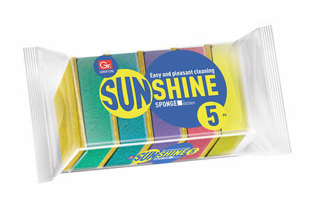 Прямоугольные губки двухслойные, цветной поролон, 5 штук в упаковке. Экономичный расход моющего средства. От легкого ополаскивания посуды, до сильных загрязнений - со всем этим губки GRIFON Sunshine справляются на отлично.