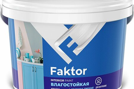 Водно-дисперсионная влагостойкая краска FAKTOR предназначена для окраски стен и потолков внутри помещений с умеренной влажностью. Удобна в работе, легко наносится на гипсокартонные, бетонные, кирпичные, оштукатуренные и зашпатлёванные поверхности, ДСП, ДВП, не образует брызг и подтёков, не мелит. После высыхания образует ровную матовую поверхность белого цвета.
