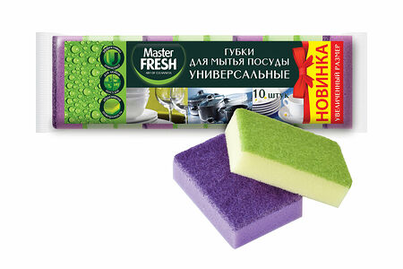 Губки для мытья посуды Master FRESH СТАНДАРТ подходят для всех видов поверхностей, отлично впитывают воду и обильно пенятся.Губки Master FRESH прослужат долго, благодаря поролону высокой плотности, качественному абразивному слою и суперпрочной склейке слоев.
