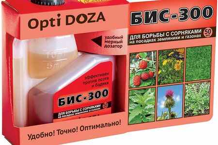 БИС-300 для борьбы с сорняками на посадках земляники и газонах. Уничтожает не только надземную часть, но и корневую систему сорняков. Особенно эффективен против осота и бодяка. Первые видимые симптомы - уже через 4-6 часов после обработки!