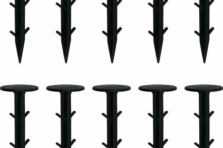 Гвозди изготовлены из пластика, длина составляет 10 см. Подходят для использования на плотных грунтах. Поставляются комплектами по 10 штук в каждом.