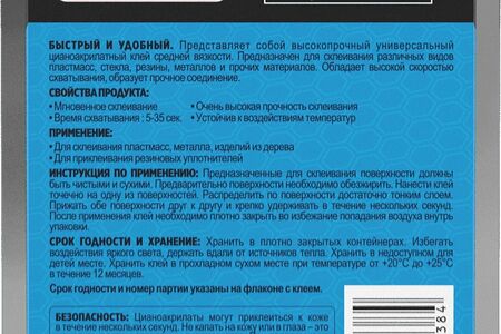 Высокопрочный универсальный цианакрилатный клей средней вязкости. Обладает высокой скоростью схватывания, образует прочное соединение.