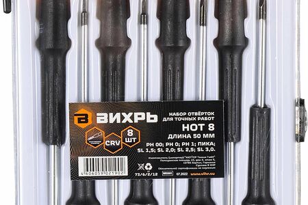 Набор отвёрток для точных работ «ВИХРЬ» предназначен для завинчивания и отвинчивания резьбовых соединений маленького размера. Отвертки из данного набора незаменимы при работе с электроникой, часами и прочими мелкими соединениями. Тыльная сторона отвертки оснащена поворотной шайбой. При помощи шайбы можно легко и быстро вращать инструмент простым перебором пальцев. Набор упакован в пластиковый бокс.входят: PH00, PH0, PH1, AWL, SL1.5, SL2.0, SL2.5, SL3.0