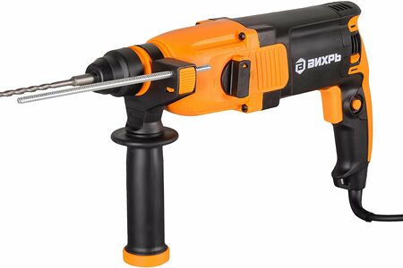 Перфоратор ВИХРЬ - электроинструмент, аналогичный дрели, но с наличием не механического, а пневматического ударного механизма. Именно поэтому перфоратор используют для сложных работ по твёрдым материалам - бетону, кирпичу, металлам. Агрегат используется для сверления и пробивания отверстий в прочных материалах без приложения особых физических усилий со стороны оператора. Принцип работы перфоратора - это разрушение обрабатываемого материала с помощью поступательных и вращательных действий рабочего элемента. Состоит перфоратор из электрического двигателя, редуктора, ударного механизма и патрона для крепления рабочих инструментов (буры, коронки, зубила и т.д.).