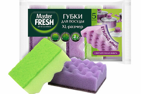 Master FRESH Губки д/мытья посуды XL-размер STRONG effect, 5шт имеют СВЕРХПРОЧНУЮ фибру 700г/м2. ДОЛГОВЕЧНАЯ. ЛЕГКО и ДЕЛИКАТНО справится с сильными загрязнениями. ПОВЫШЕННОЙ плотности поролон 22г/м2 нежного лавандового и салатового цветов. ПОВЫШЕННОЕ пенообразование. УДОБНАЯ, КАЧЕСТВЕННАЯ РЕЛЬЕФНАЯ поверхность, позволит Вам нанести моющее средство на губку, не проронив ни единой капли.