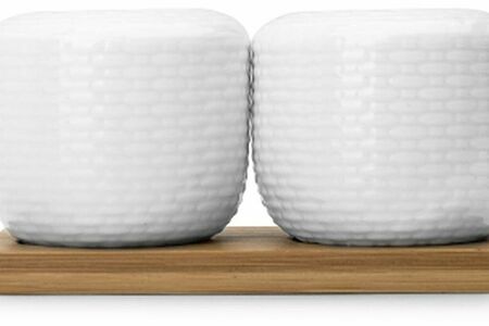 Набор из солонки и перечницы на бамбуковой подставке, выполнен из фарфора в изящном современном дизайне. Изделия имеют рельефный декор внешней поверхности.