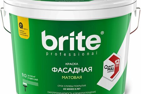 Краска Brite Professional Quality Full Control фасадная матовая. Образует долговечное «дышащее» покрытие, устойчивое к атмосферным воздействиям и перепадам температур, в том числе в условиях северных широт.