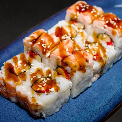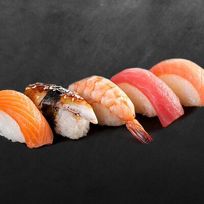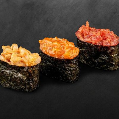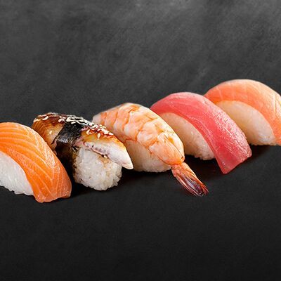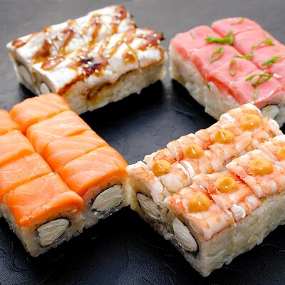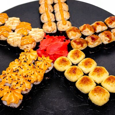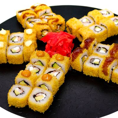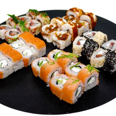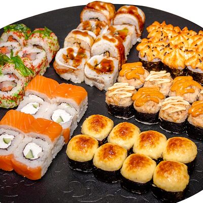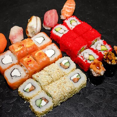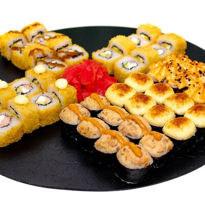 Филадельфия классик, Нежный лосось, Калифорния с креветкой, Суши сет (5 шт.), Гунканы (3 шт.)