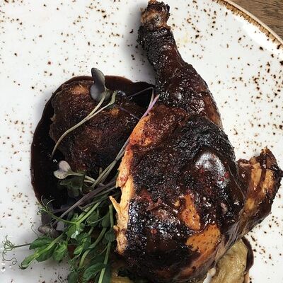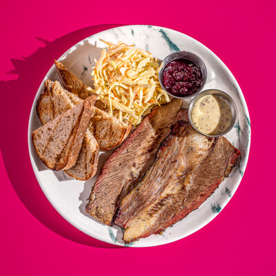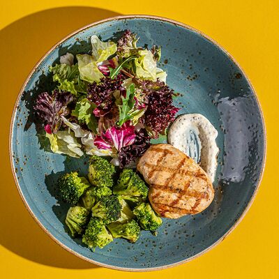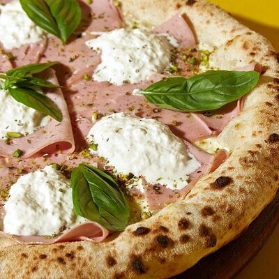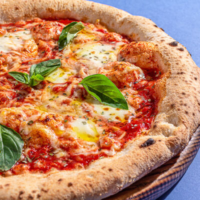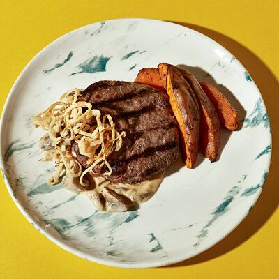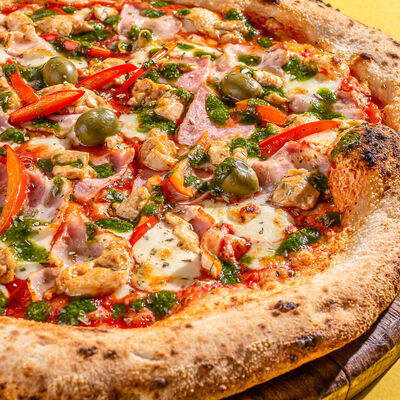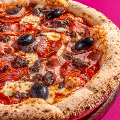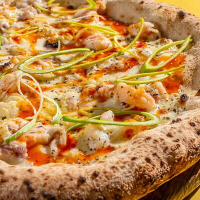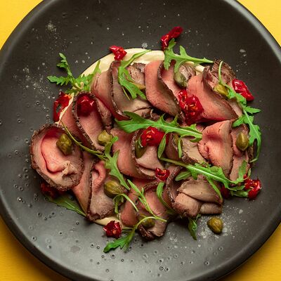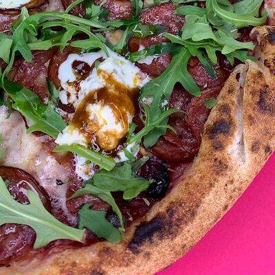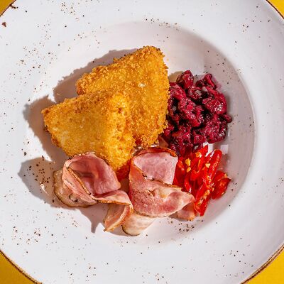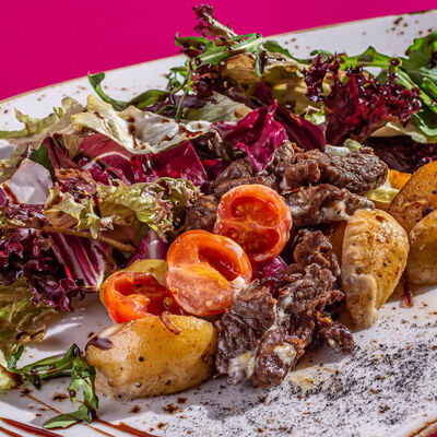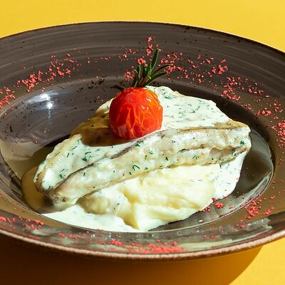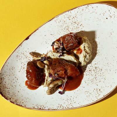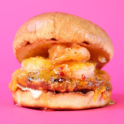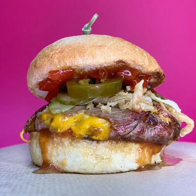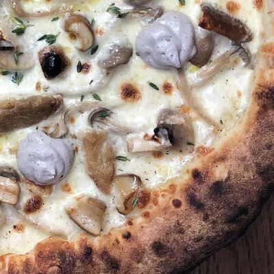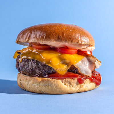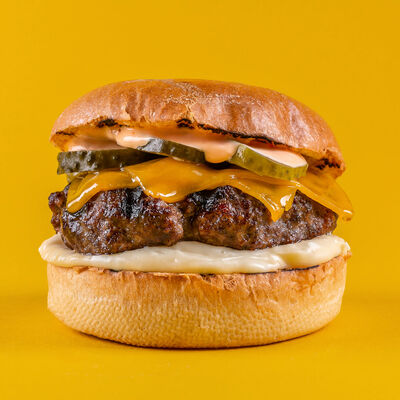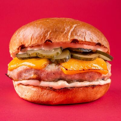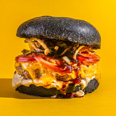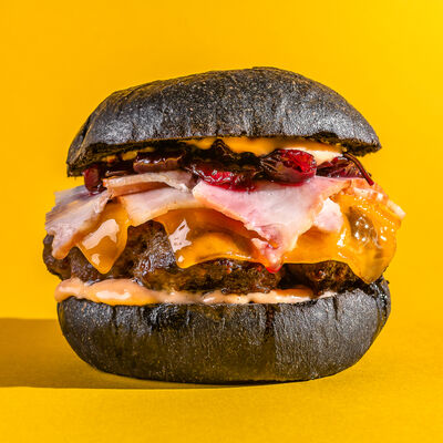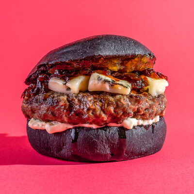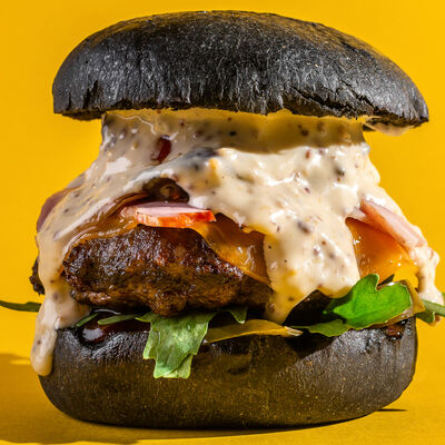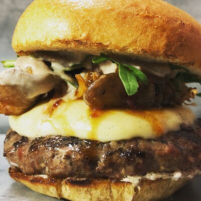 Бургер с котлетой из говядины, моцареллой, соусом с белыми грибами, вешенками и трюфельным кремом