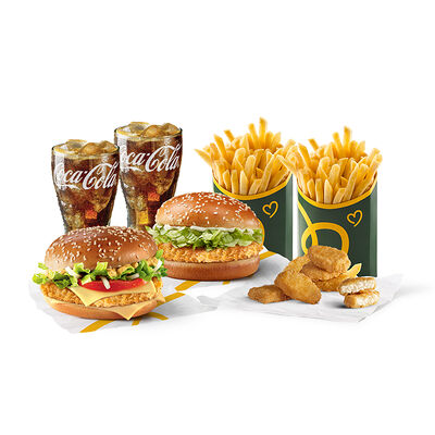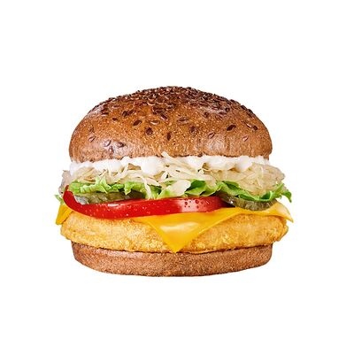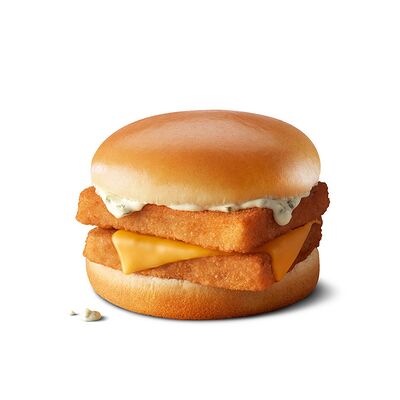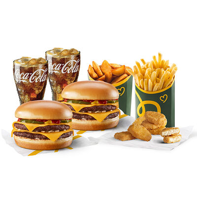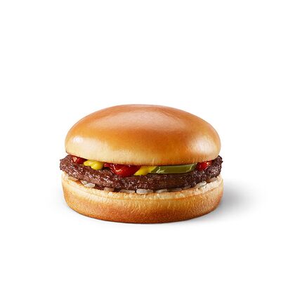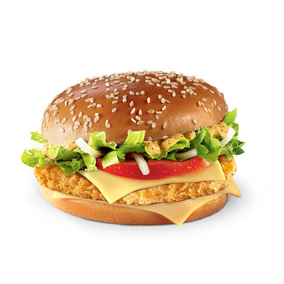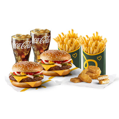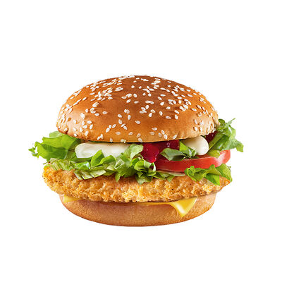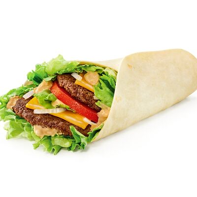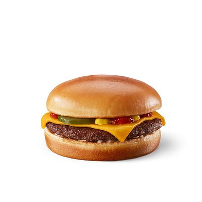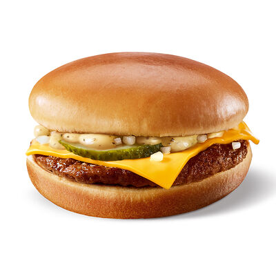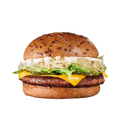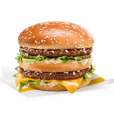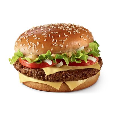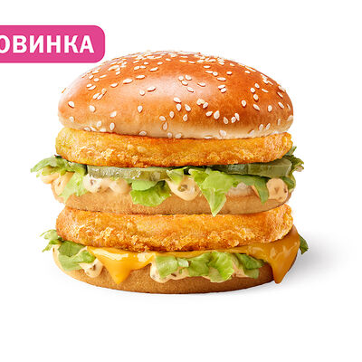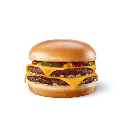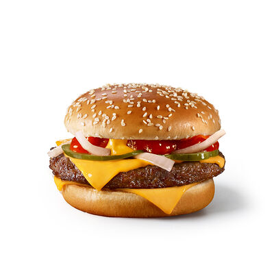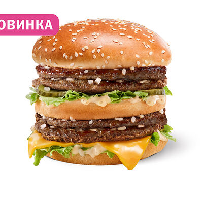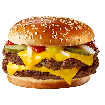 Пышная булочка с кунжутом с двумя большими сочными рубленными бифштексами из 100% натуральной говядины, двумя ломтиками ароматного сыра Чеддер, луком, маринованными огурчиками, с добавлением пикантной горчицы и сладкого кетчупа