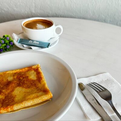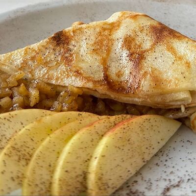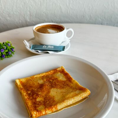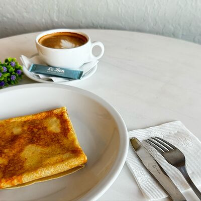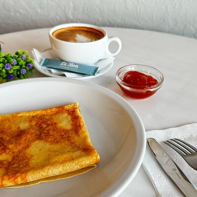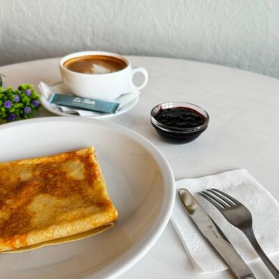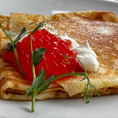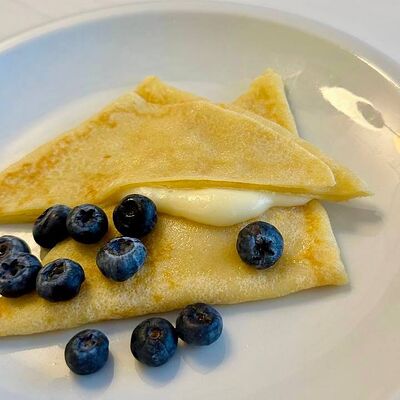 Блинчик, творог протертый, варенье черничное, масло сливочное