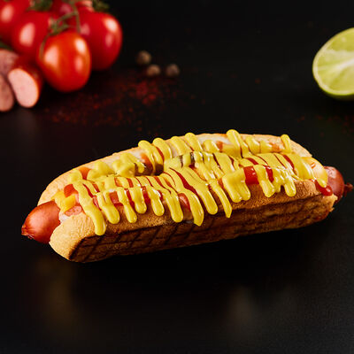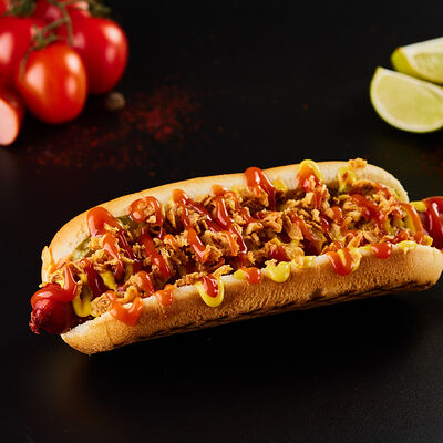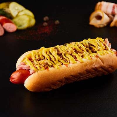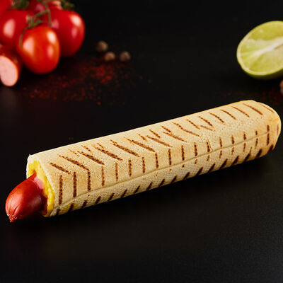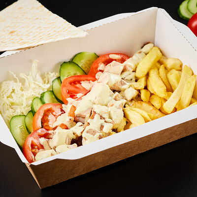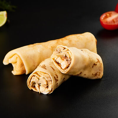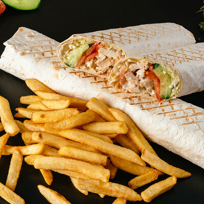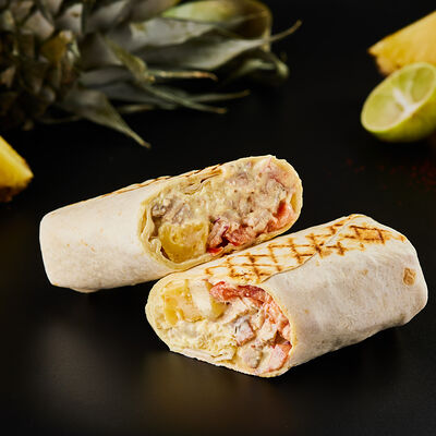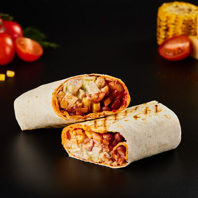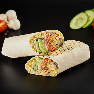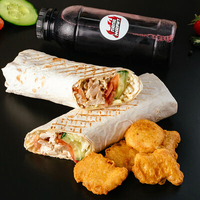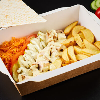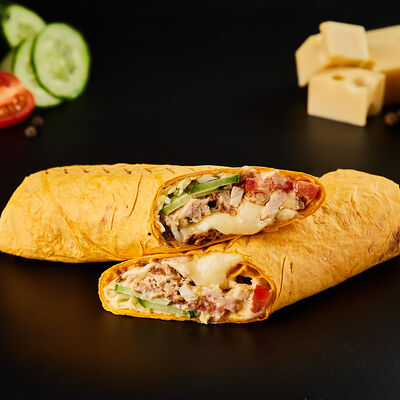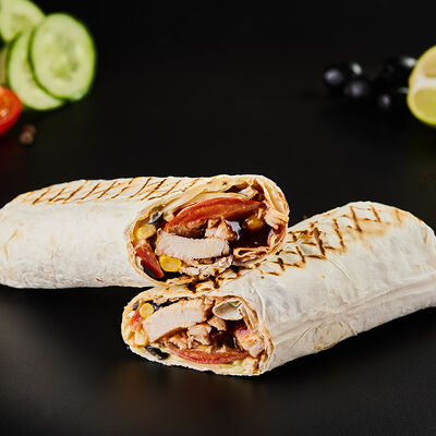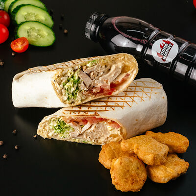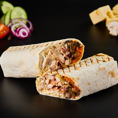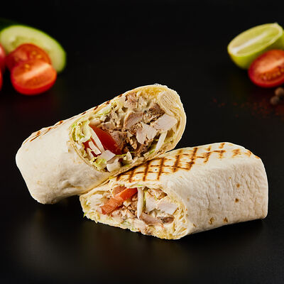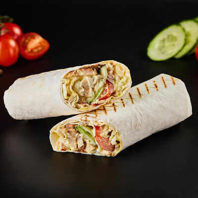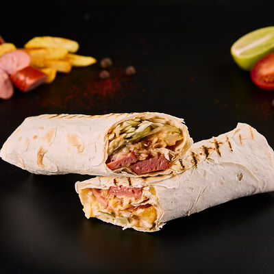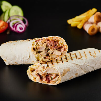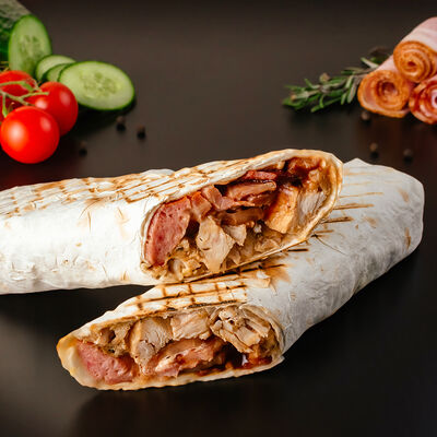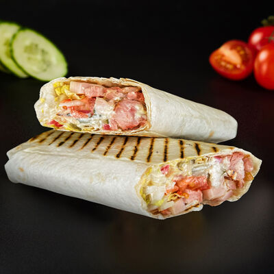Лаваш тандырный, копченая курочка, пекинская капуста, свежий томат, огурец соленый, лук маринованный, горчичный соус