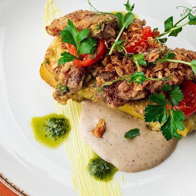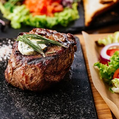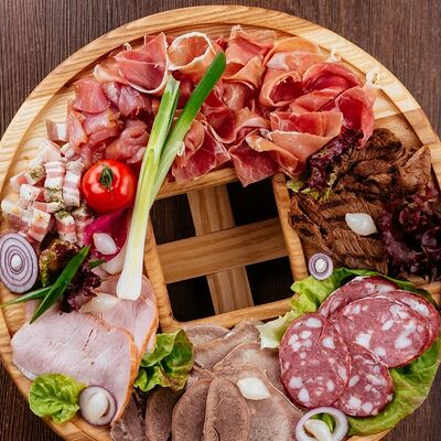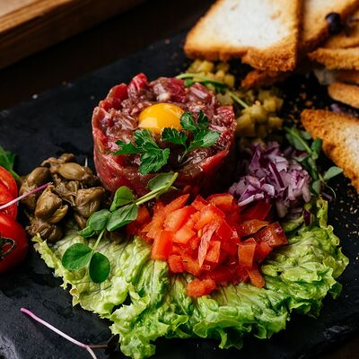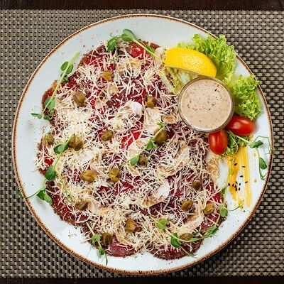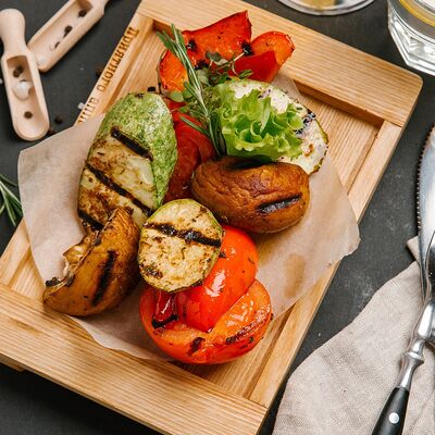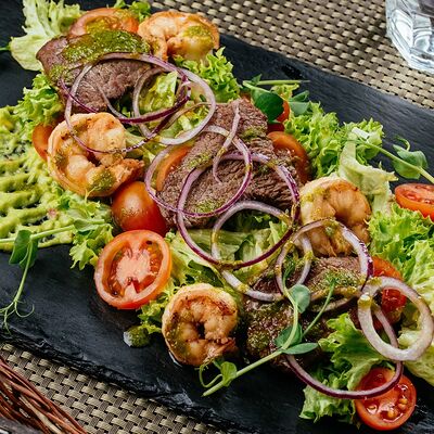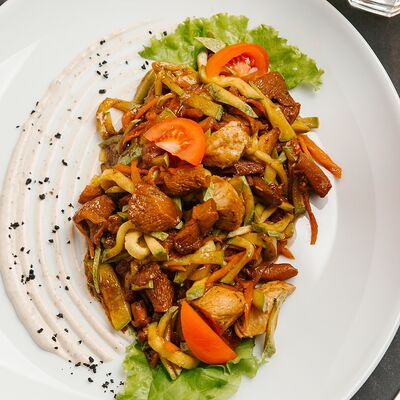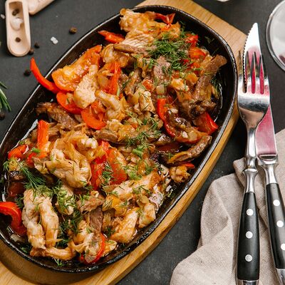 Вырезка говяжья, филе птицы, перец сладкий, свежие помидоры, лук-порей, чеснок, кетчуп