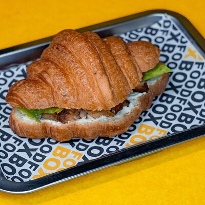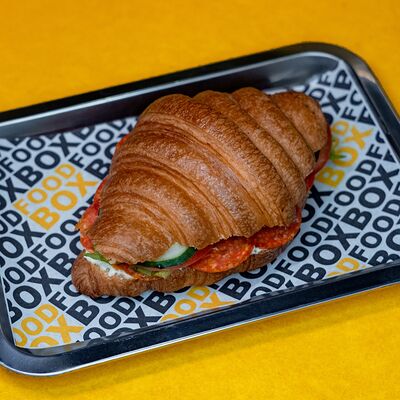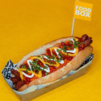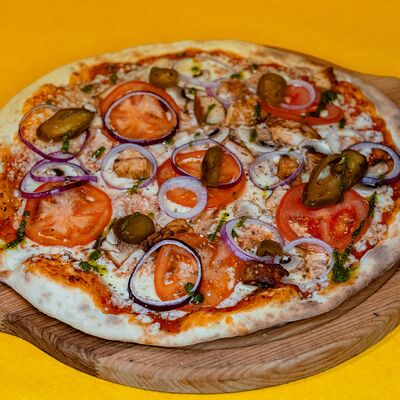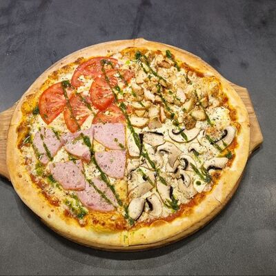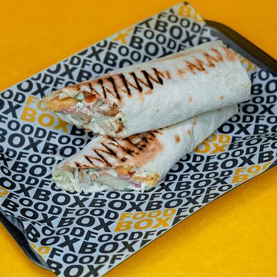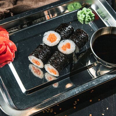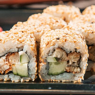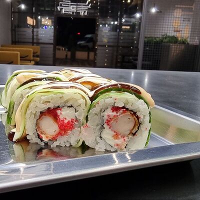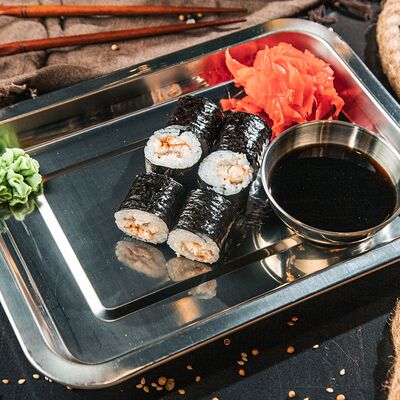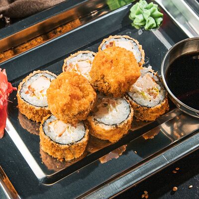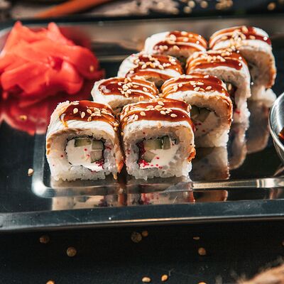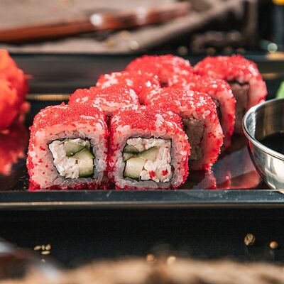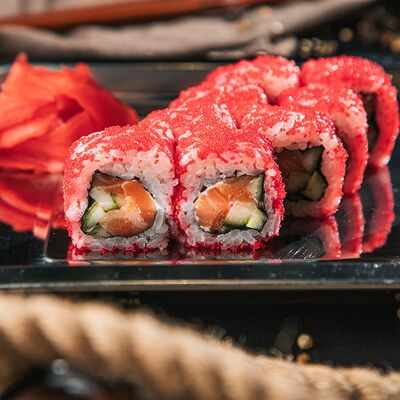 Водоросли нори, рис, соус спайси, краб, креветки. Шапочка: майонез, сыр моцарелла, кетчуп, икра масаго