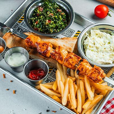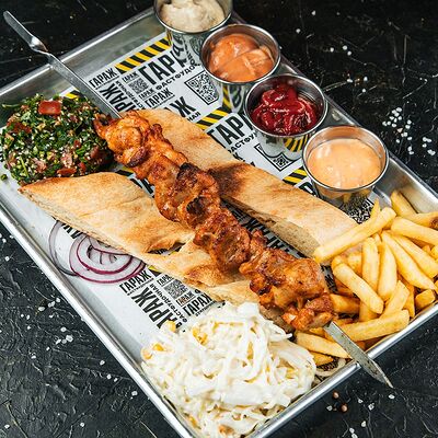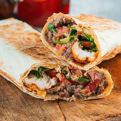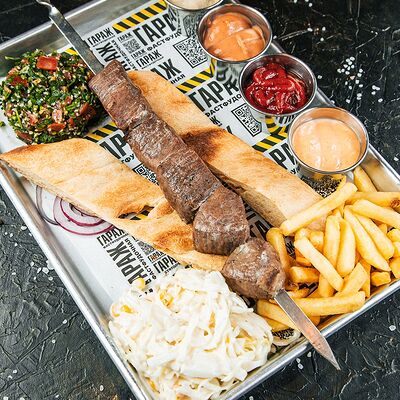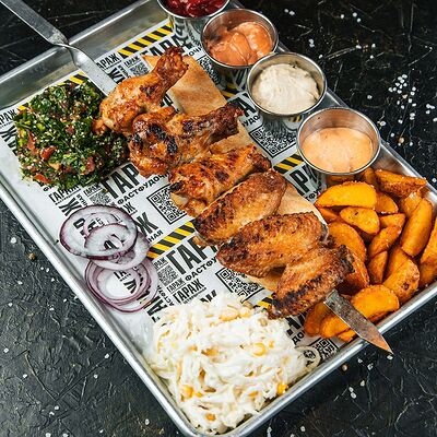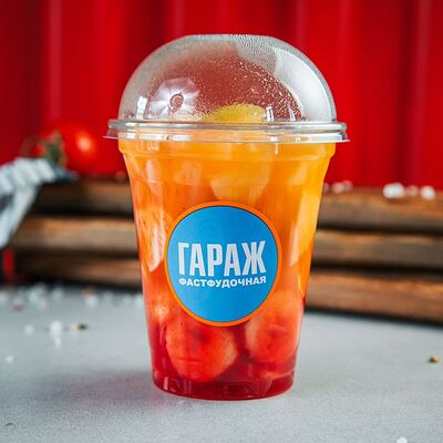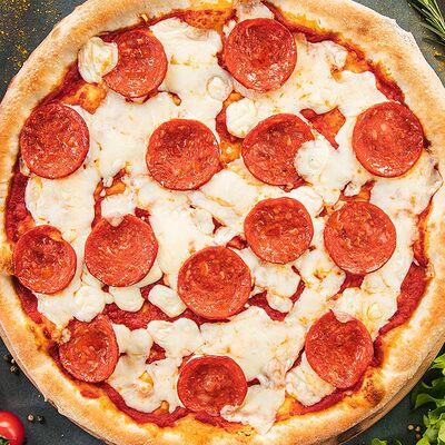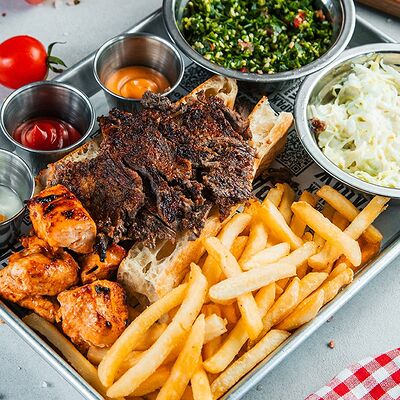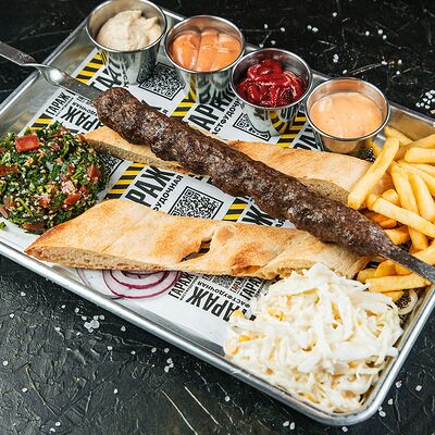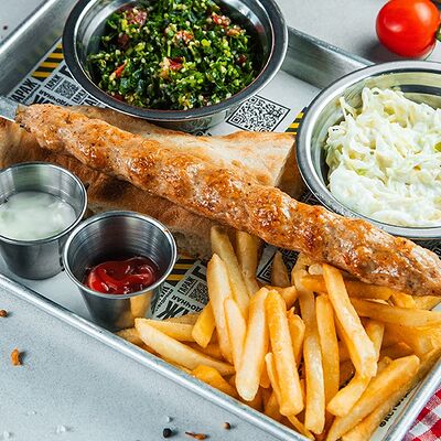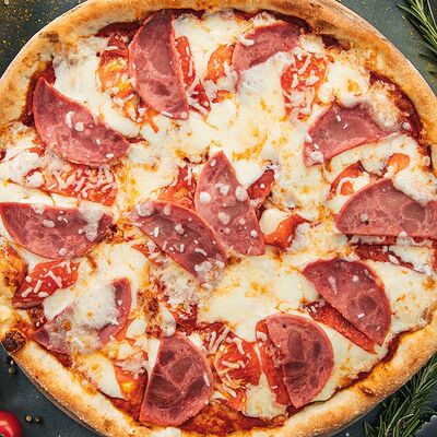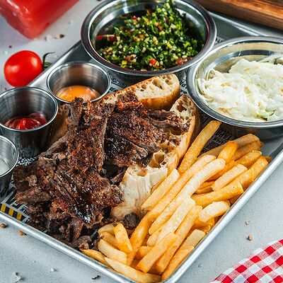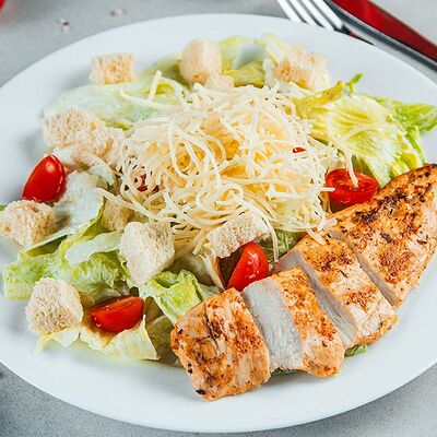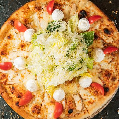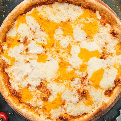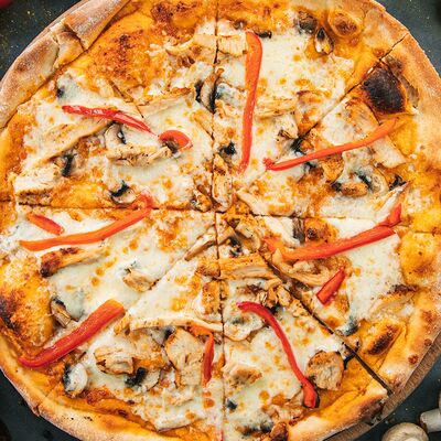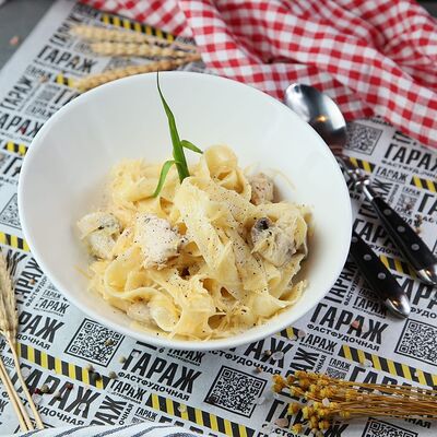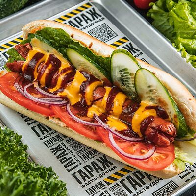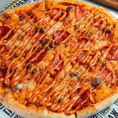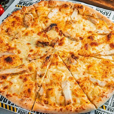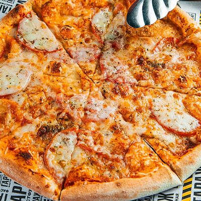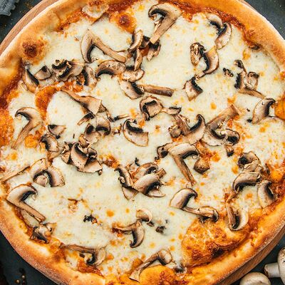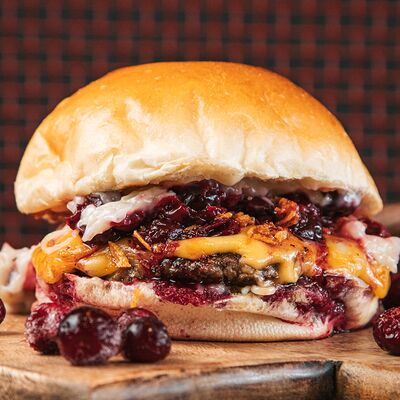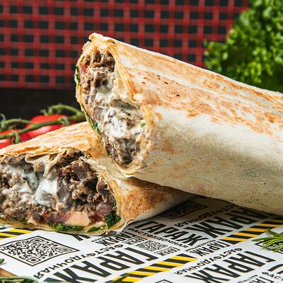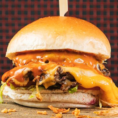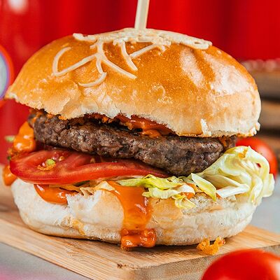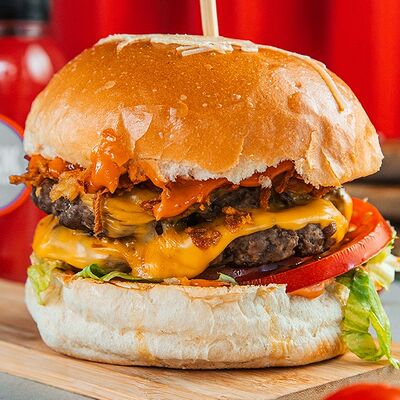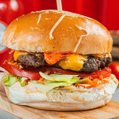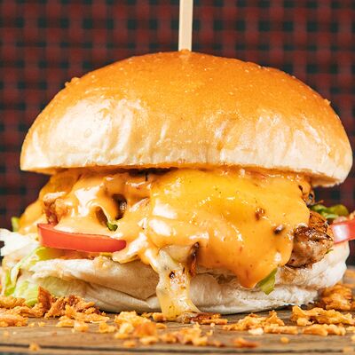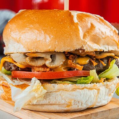 Сырная мягкая булочка, сочная котлета из говядины, сыр чеддер, салат айсберг, помидор, хрустящий лук фри и сливочный соус с кусочками шампиньонов и сыром моцарелла