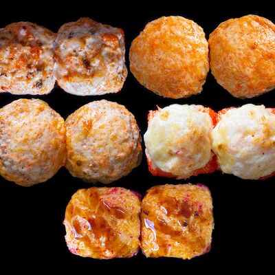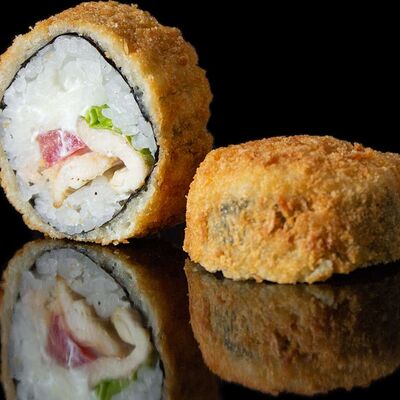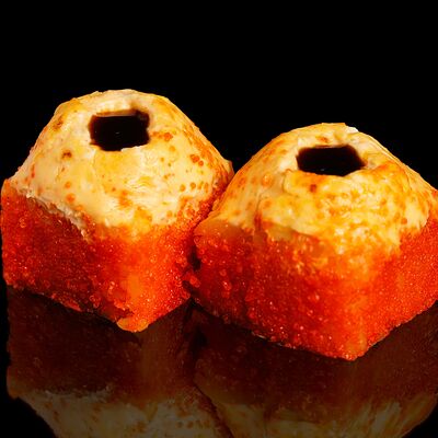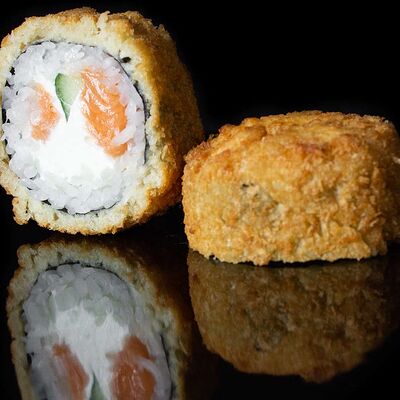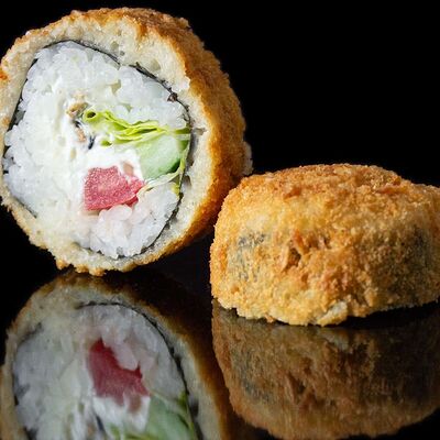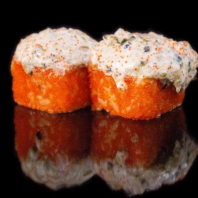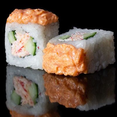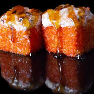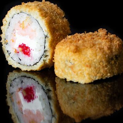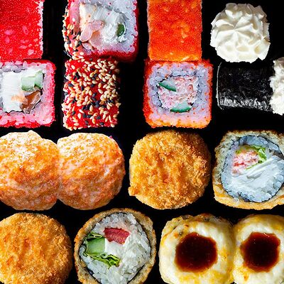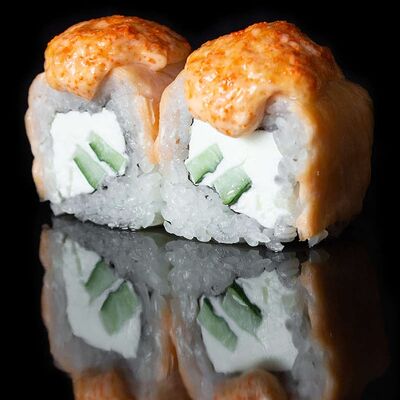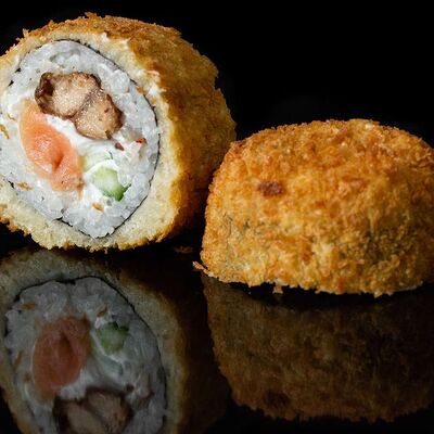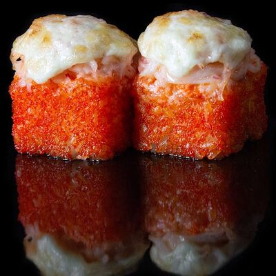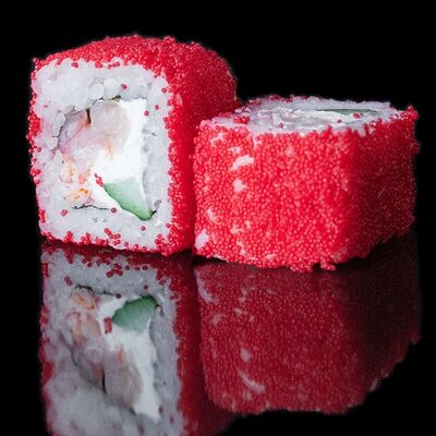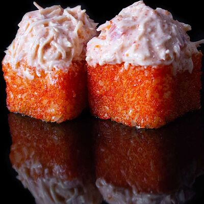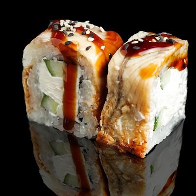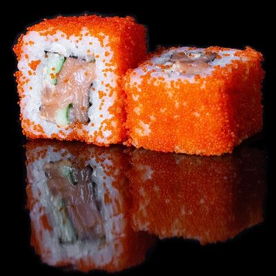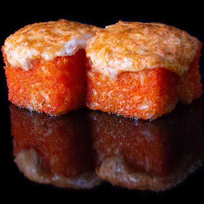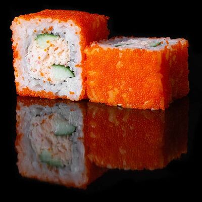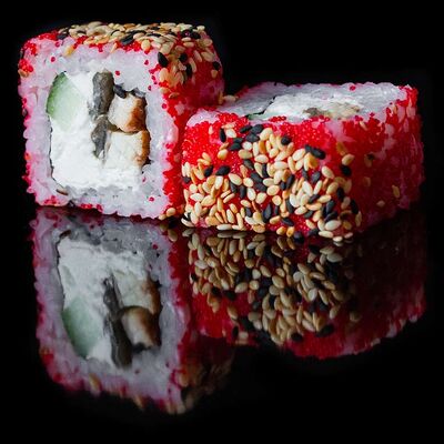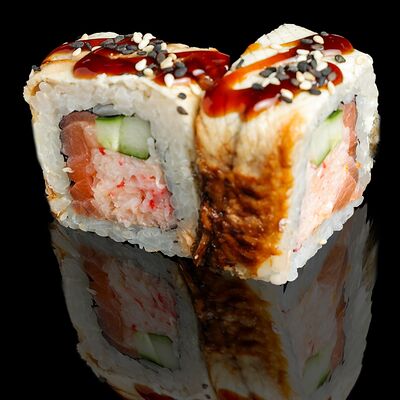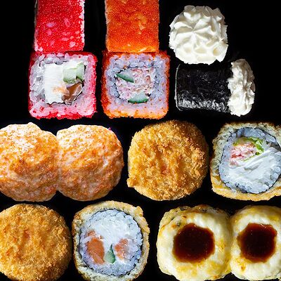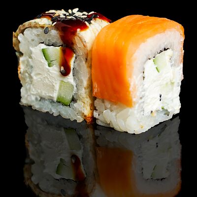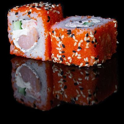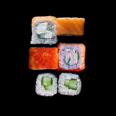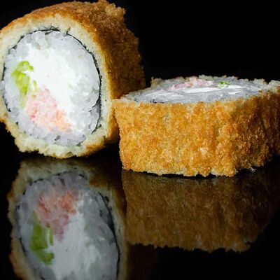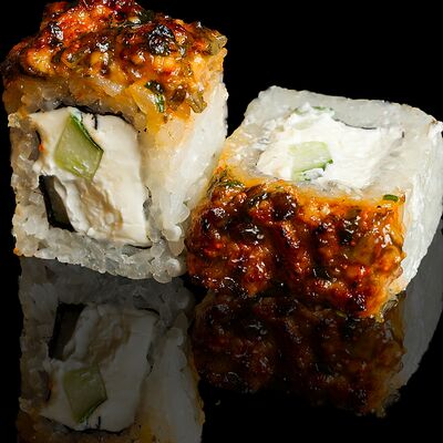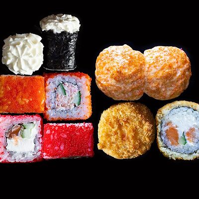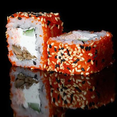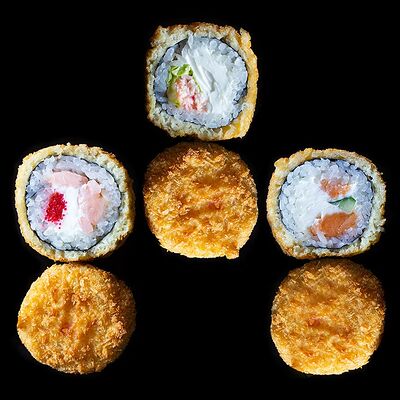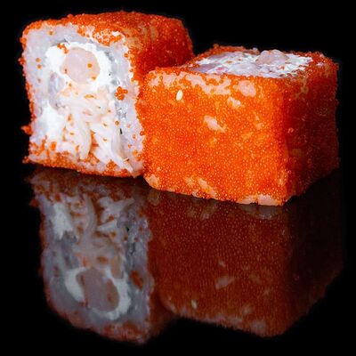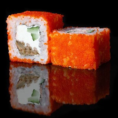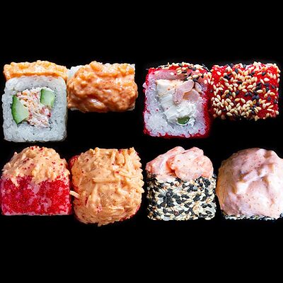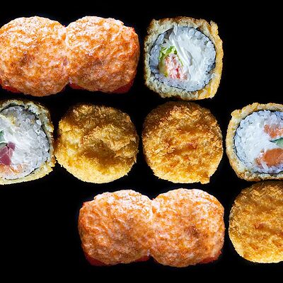 5 роллов: ролл Филадельфия в тобико (8 шт.), ролл Калифорния с крабом (8 шт.), запеченный Ё-Ролл (8 шт.), жареный ролл Сяке Унаги (10 шт.), ролл Крабик (6 шт.)