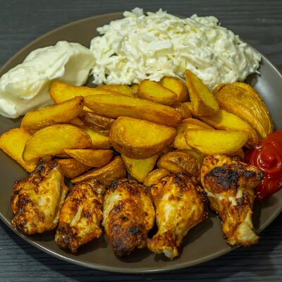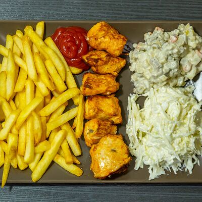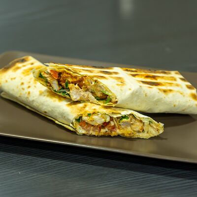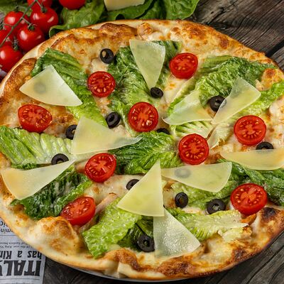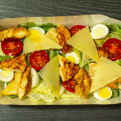 Филе цыпленка, салат айсберг, салат романо, сыр пармезан, яйца перепелиные, соус Цезарь, сухари (халяль)