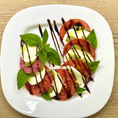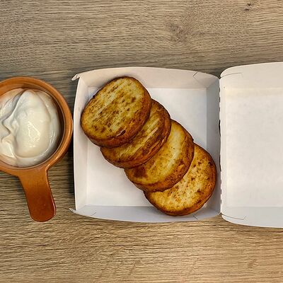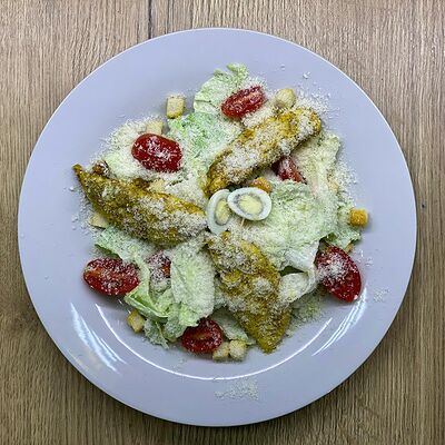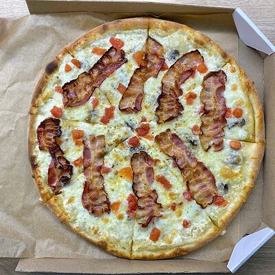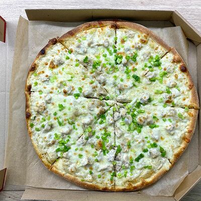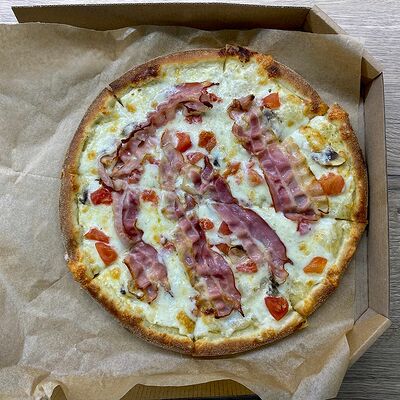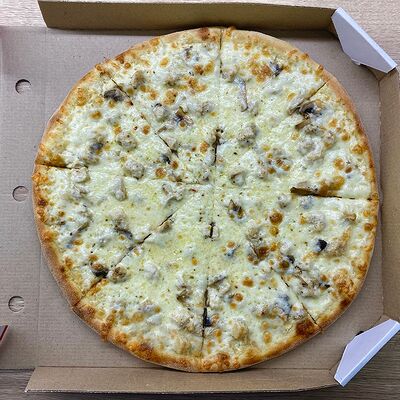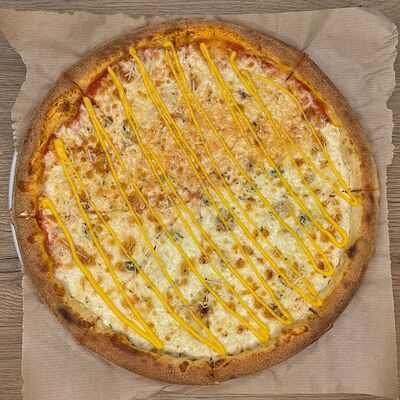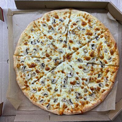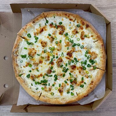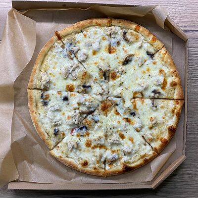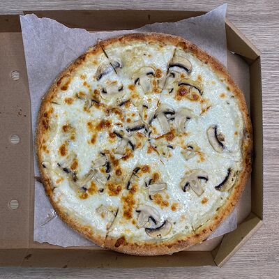 Соус сливочный, сыр моцарелла, шампиньоны, лук жареный, зелень (31 см)