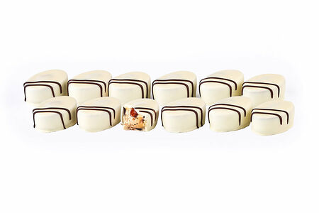 Конфета с нежным кокосовым кремом в слое темного и белого шоколада. Мы дополнили ее вафельной крошкой и цельным миндалём для необычной текстуры! Создана и декорирована конфета с кокосовой начинкой вручную (12 шт.)