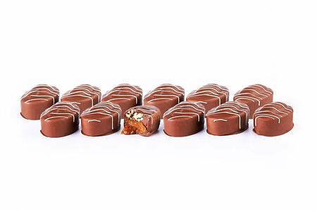 Именно пекан - главный акцент этой конфеты, он утопает в карамели с пастой из фундука. Покрывает конфету таящий молочный шоколад. Конфета создана и декорирована вручную. Сет из 12 конфет