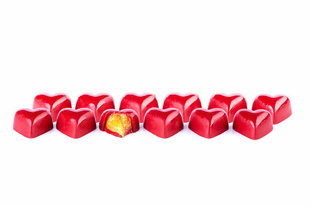 Конфета в форме сердца насыщенного алого цвета с нежным муссом из манго и маракуйи. Алое сердце и нежный мусс из тропических фруктов сделал эту конфету одной из самых востребованных в нашем ассортименте! Мы используем натуральный краситель – кармин, который придает цвет белому шоколаду