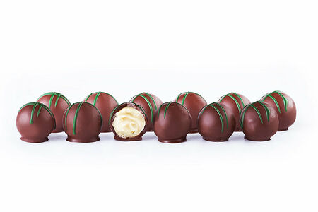 В основе конфеты нежный сливочный крем с натуральной сушеной мятой. Начинка дополнена каплей ликера Лимончелло. Терпкий темный шоколад искусно оттеняет свежесть десерта! Создана и декорирована конфета с мятным вкусом вручную. Сет из 6 конфет