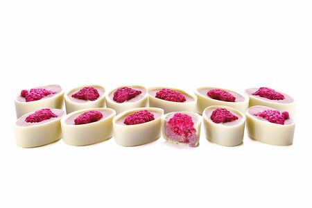 Яркая малина и сливочно-ореховый кешью — этот необычный дуэт в корпусе из белого шоколада поражает своим многогранным вкусом! Слой из малинового мусса покрыт еще одним слоем нежной джандуйи, смеси из белого шоколада, кешью-пасты и сублимированной малины, — и всё это в тонкой шоколадной лодочке. Попробуйте летнюю новинку и разделите радость момента с близкими (12 шт.)