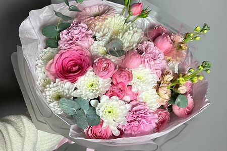 Состав: Хризантема Розы кустовые Розы сортовые Эвкалипт Маттиола Диантус