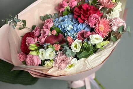 Состав: Гортензия 1 Оксипиталум 3 Калла 1 Лизиантус 2 Герберы 2 Кустовая Роза 3 Гвоздика 3 Роза 2 Тишью 2 Пленка 2