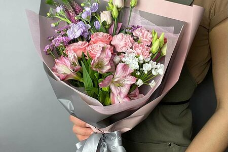 Состав: Вероника 1 Сантини 2 Лизиантус 2 Роза 1 Роза кустовая 2 Альстромерия 2 Аллиум 1 Гвоздика кустовая 1 Матиола 1