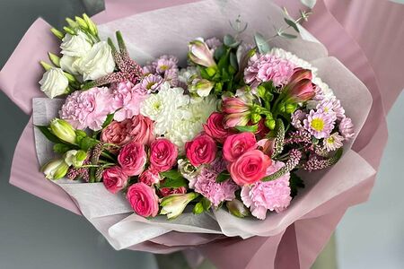 Состав: Вероника Альстромерия Магнум Лизиантус Кустовая Роза Роза Сантини Хризантема