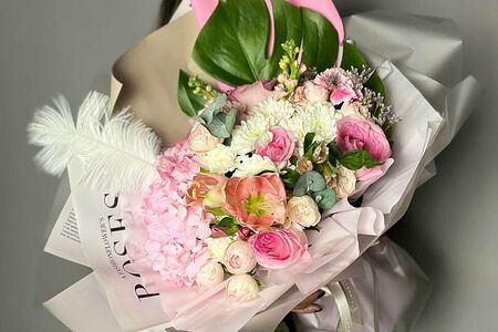 Состав: Амариллис Гортензия Розы сортовые Розы кустовые Маттиола Альстромерия Монстера