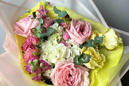 Роза садовая пионовидная 3 Розы кустовые пионовидные 1 Маттиола 2 Гортензия 1 Эвкалипт 2