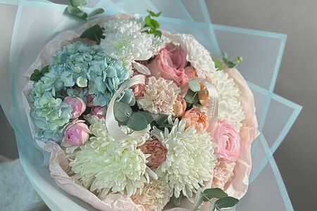 Состав : Гортензия 2 шт Хризантема Антонов 3шт Роза Эквадор 1шт Хризантема кустовая 1шт Роза кустовая пионовидная 2шт Гвоздика 2шт Эвкалипт