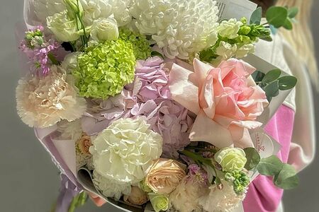 Хризантема одноголовая Лизиантус Антир Гортензия гвоздика Матиола Эвкалипт Роза эквадор Выбернум