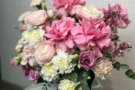 Состав: Роза Wow 5 шт Ранунклюс 3 шт Гортензия 1 шт Лизиантус 3шт Дианиус 9 шт Роза кустовая пионовидная 2шт