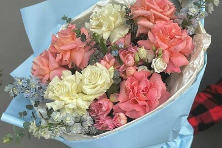 Роза Эквадор 8 Роза куст пионовидная 2 Эвкалипт Писташ Лагурус 3 Дельфиниум 3 Оксипиталум 2