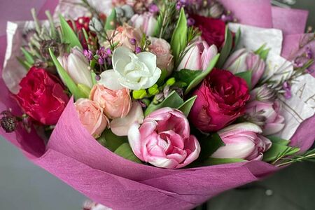 Тюльпаны, 5 Роза, 5 Роза кустовая 1 ананас, 1 хамелациум, 3 бруния 1 фрезия,1 астранция, 1