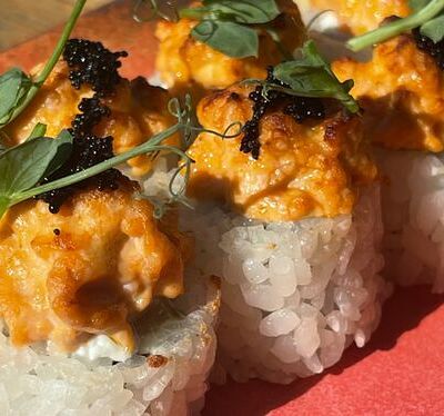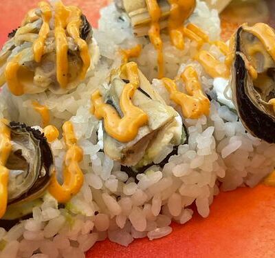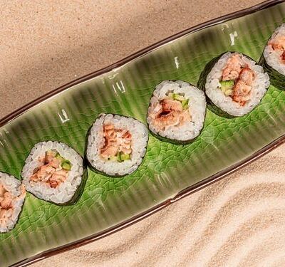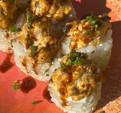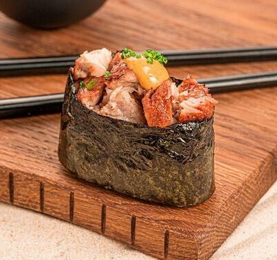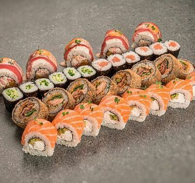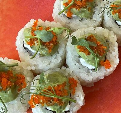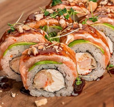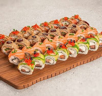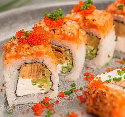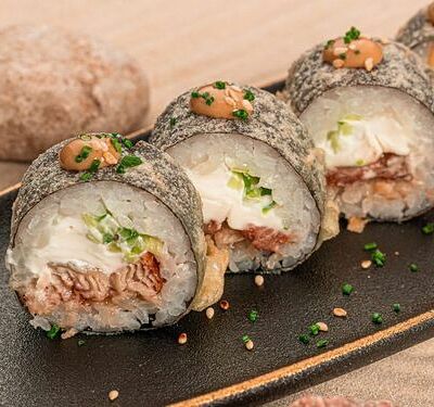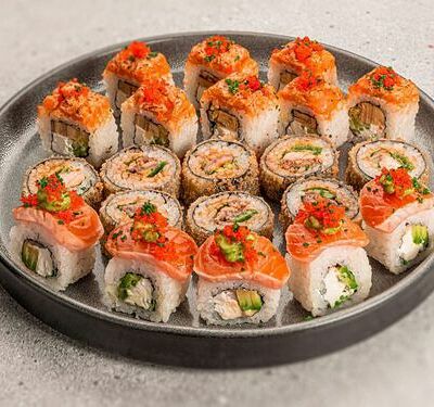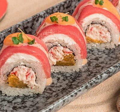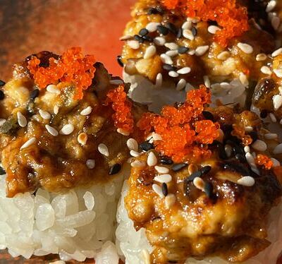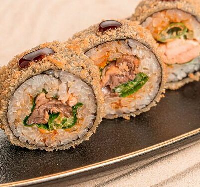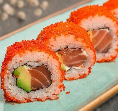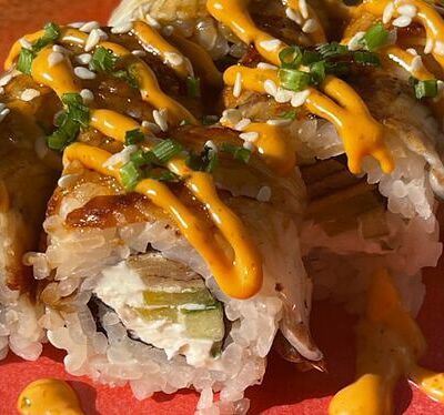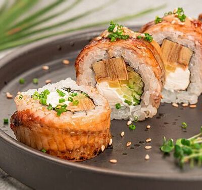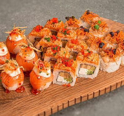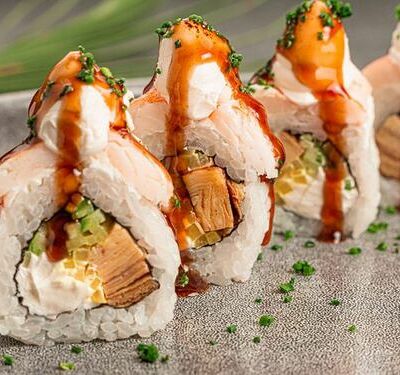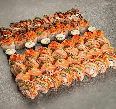 Рис, желток, соус спайси, такуан, угорь, соус терияки, сливочный сыр, кужут