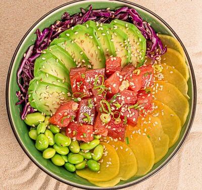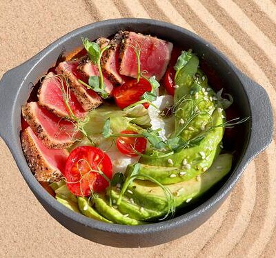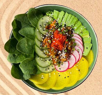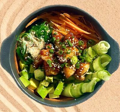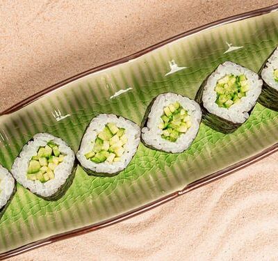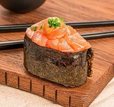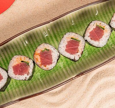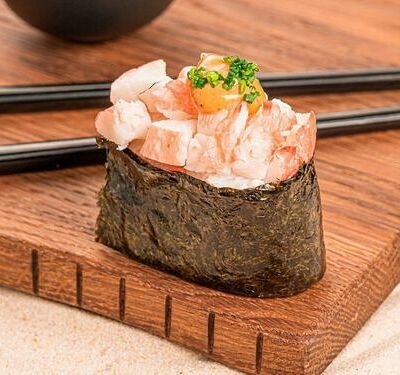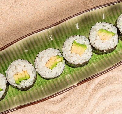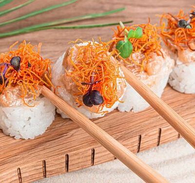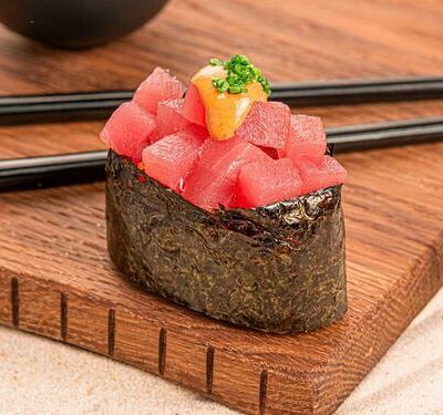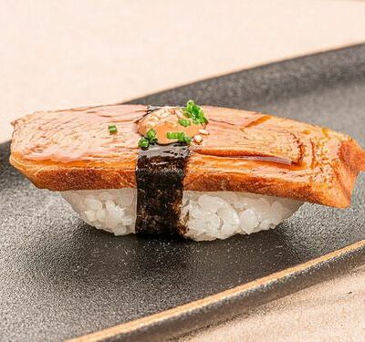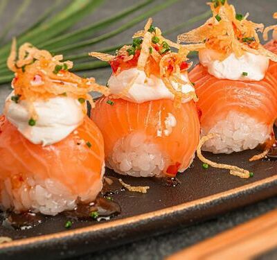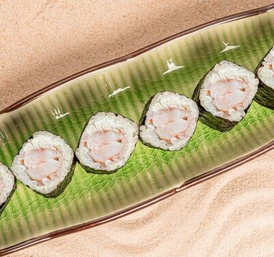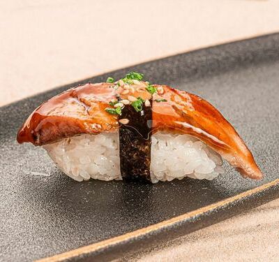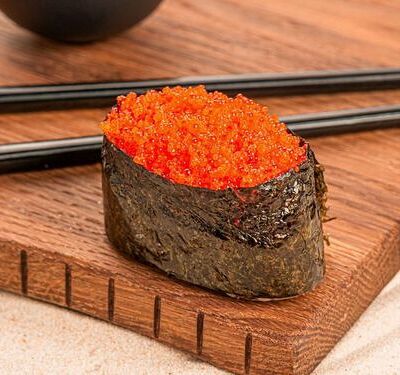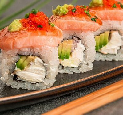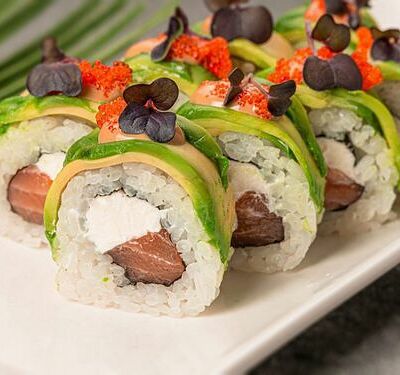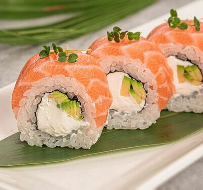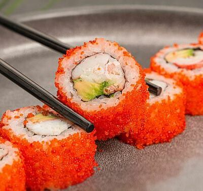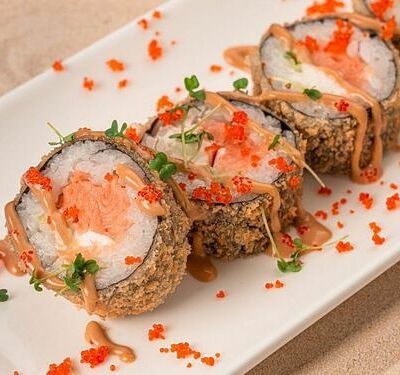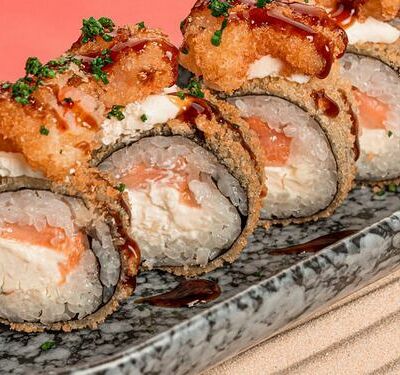 Рис, желток, соус спайси, такуан, угорь, соус терияки, сливочный сыр, кужут