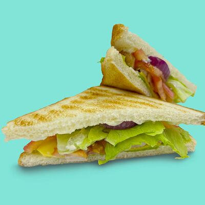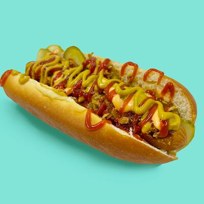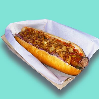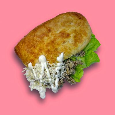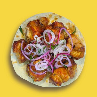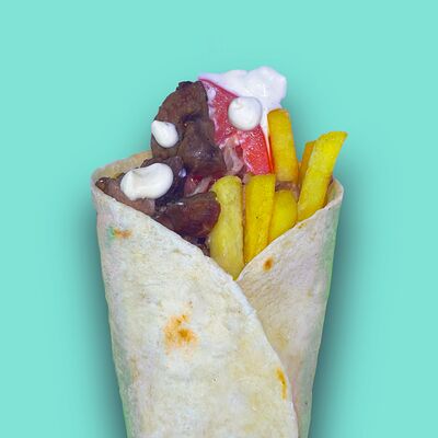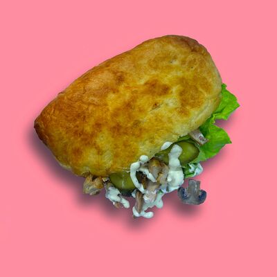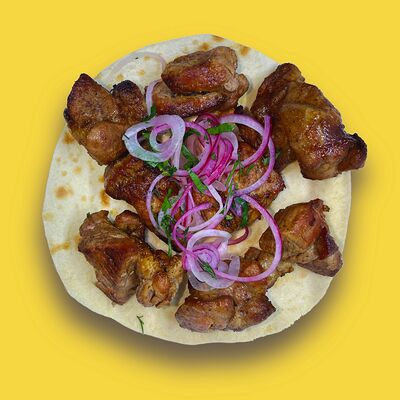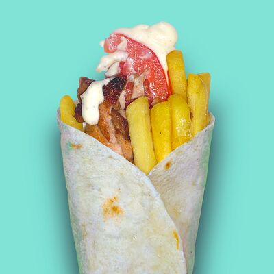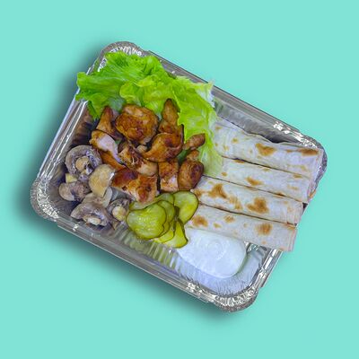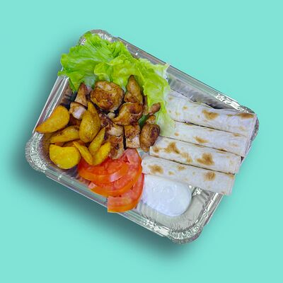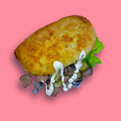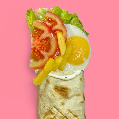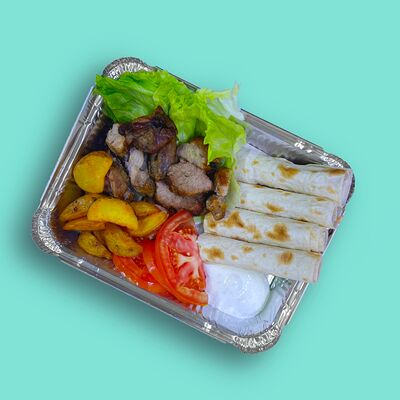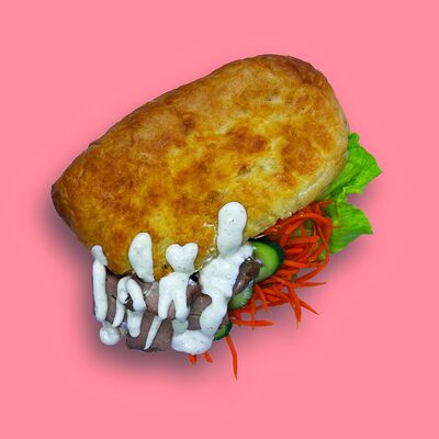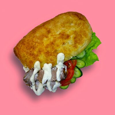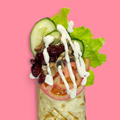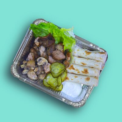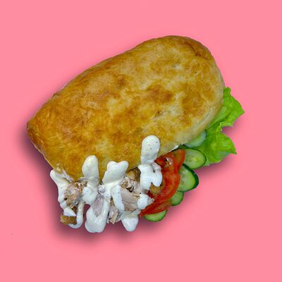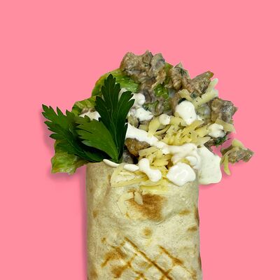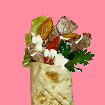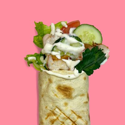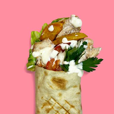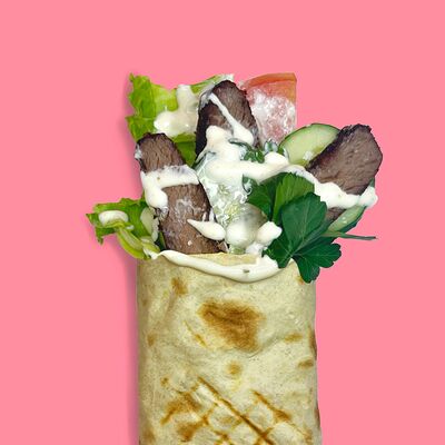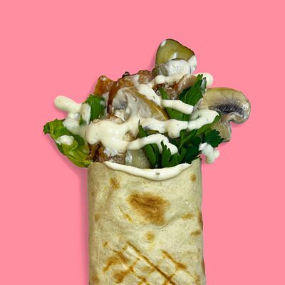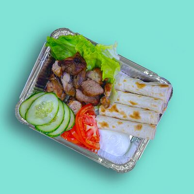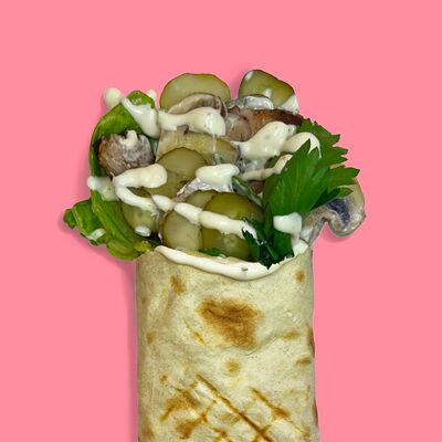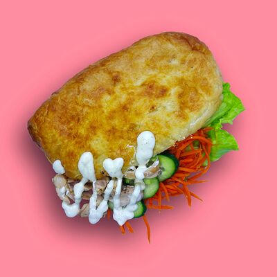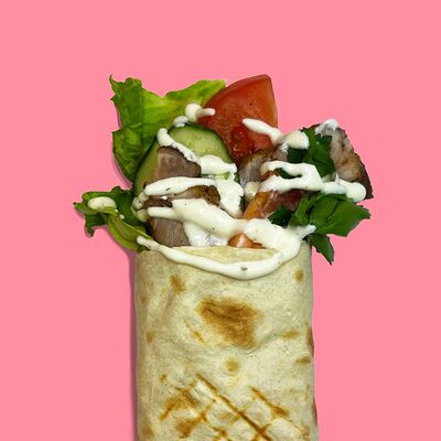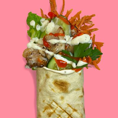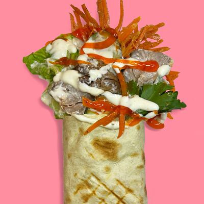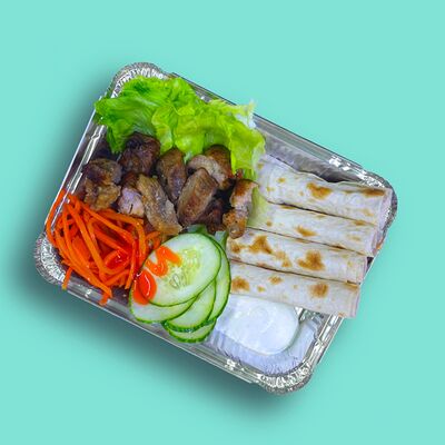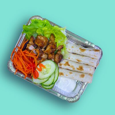 Свинина, лаваш, огурец свежий, морковь по-корейски, салат айсберг, белый соус, соус чили