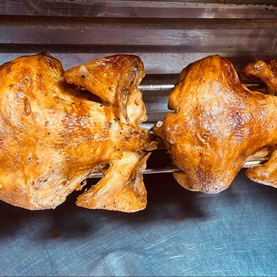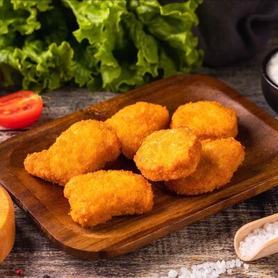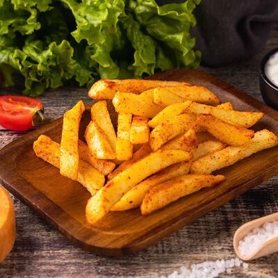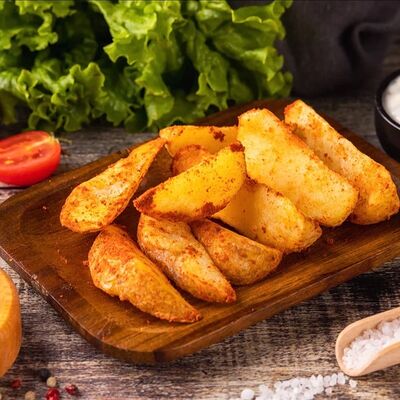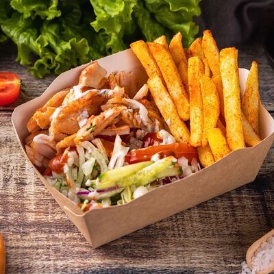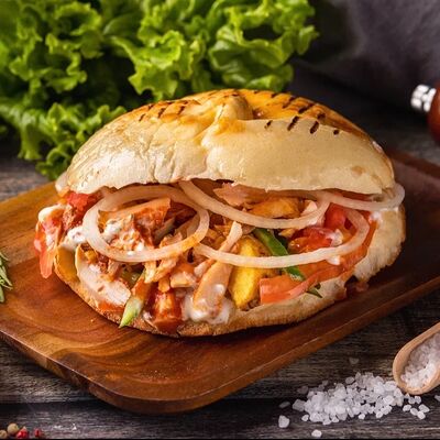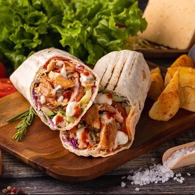 Пшеничная лепешка, маринованное куриное мясо, свежие томаты, свежие огурцы, маринованные огурцы, свежий лук, картофель по-деревенски, два фирменных соуса: чесночный и томатный