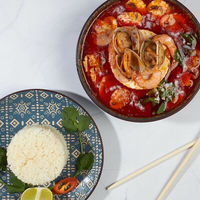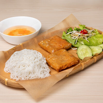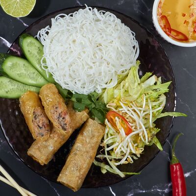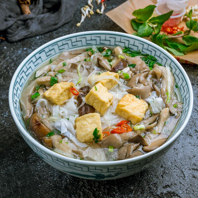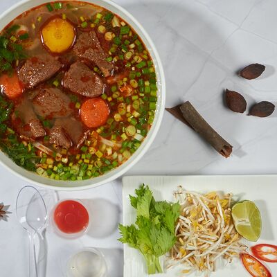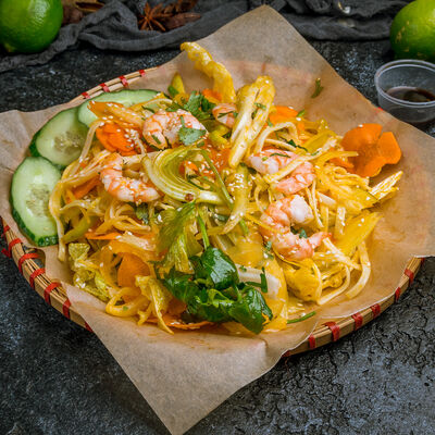 С камчатским крабом, свининой, грибами муэр, грибами шиитаке, репчатым луком, зеленым луком, кориандром, морковью, кольраби, рисовой лапшой бун, ростками бобов и вьетнамскими специями