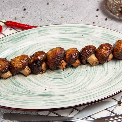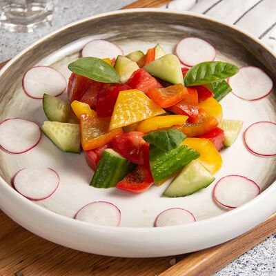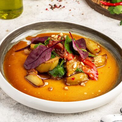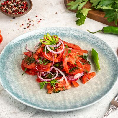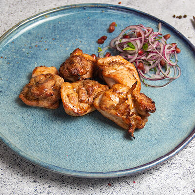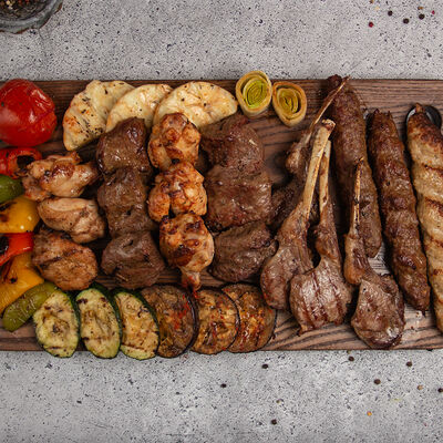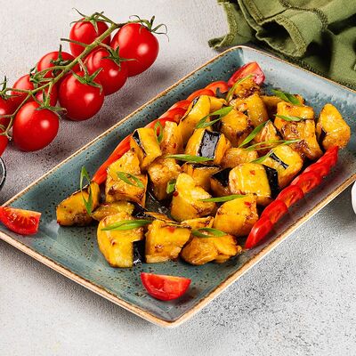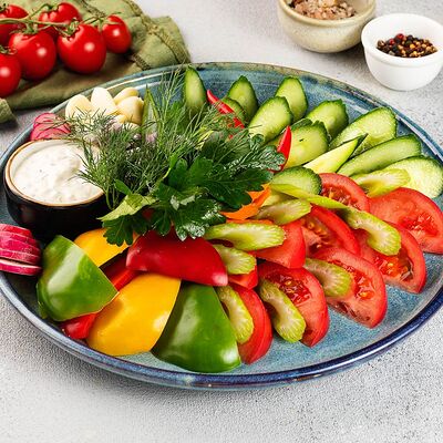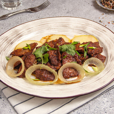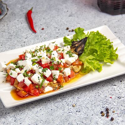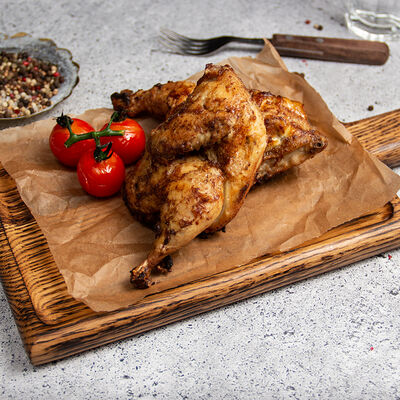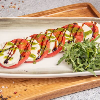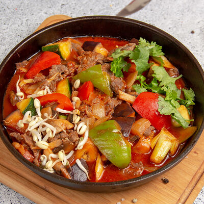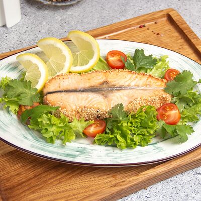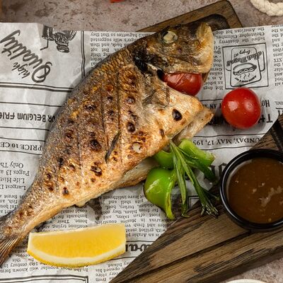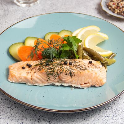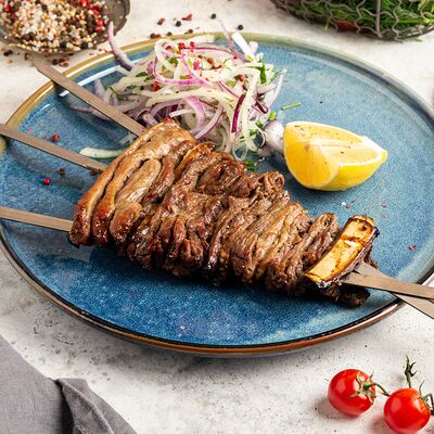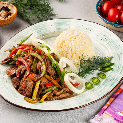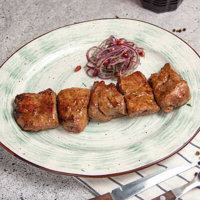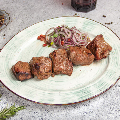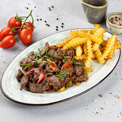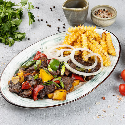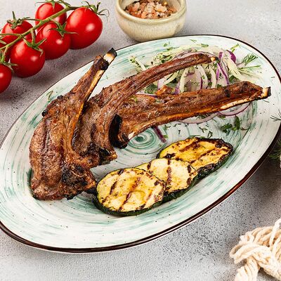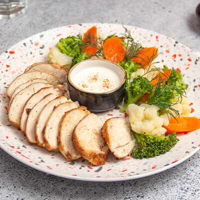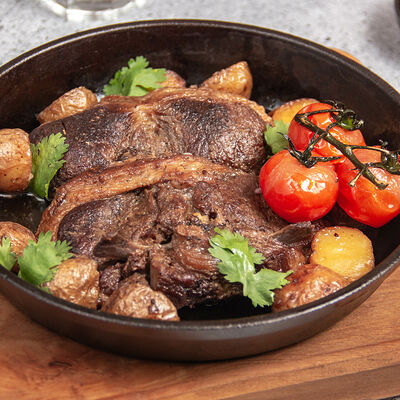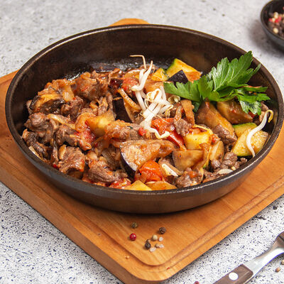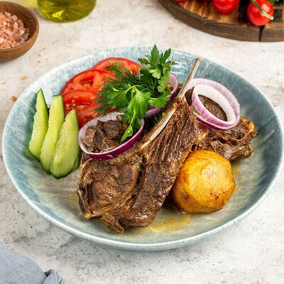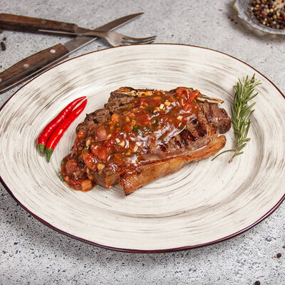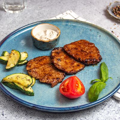 Сочный стейк из телятины, приготовленный на гриле. Подается с цукини, луком порей и томатами черри