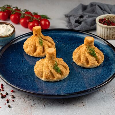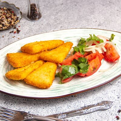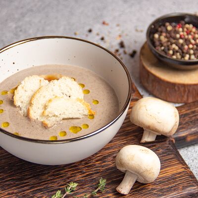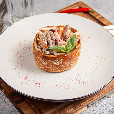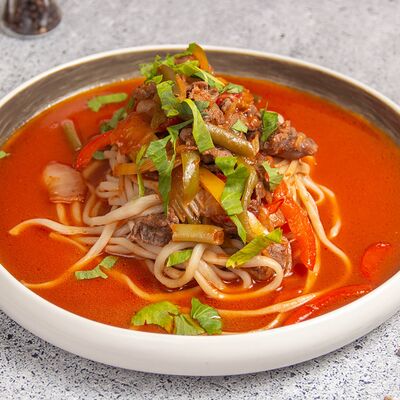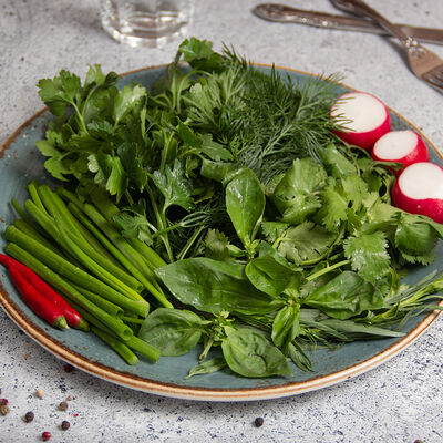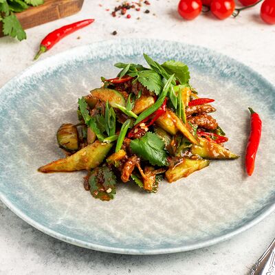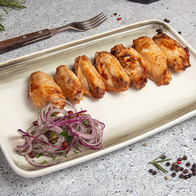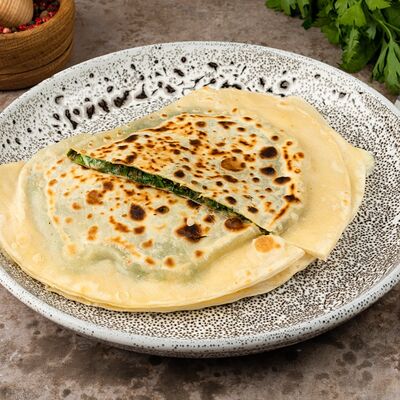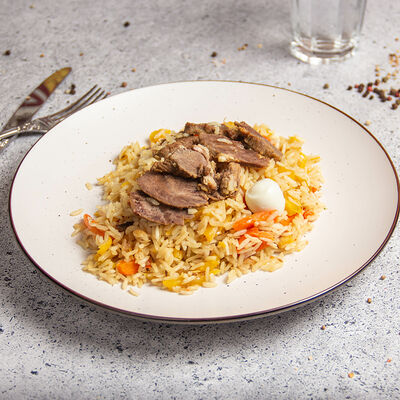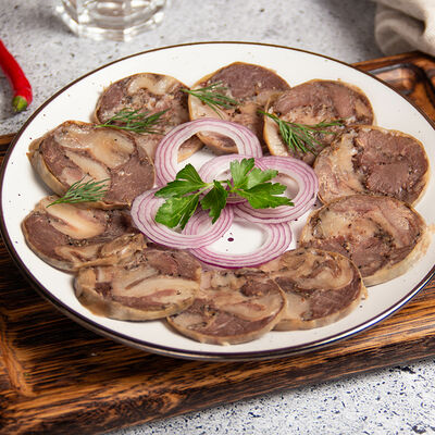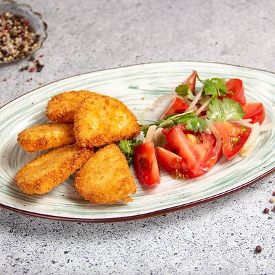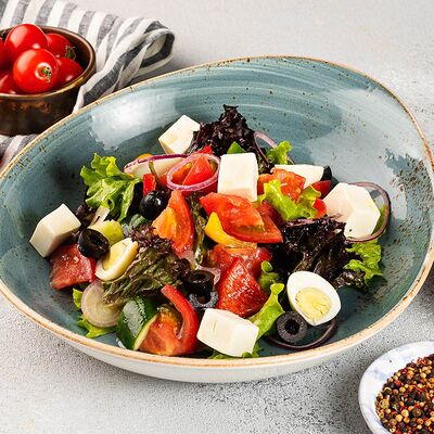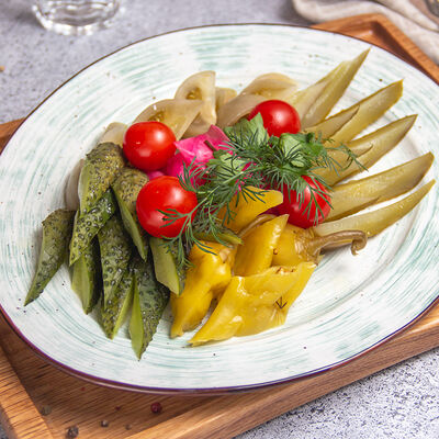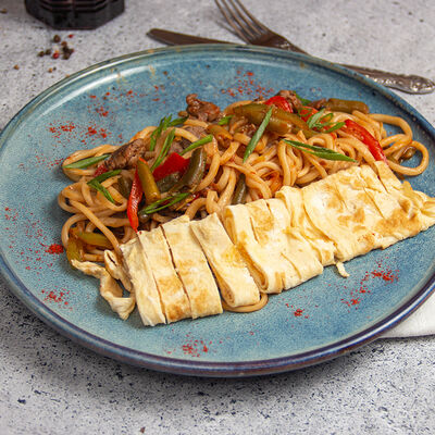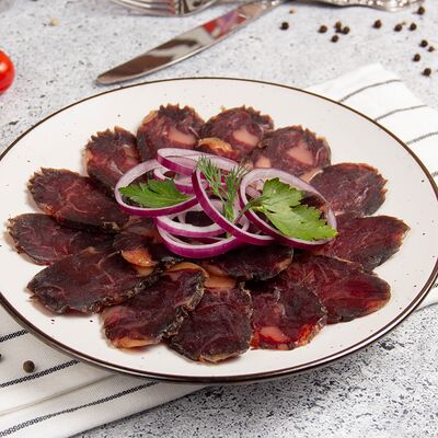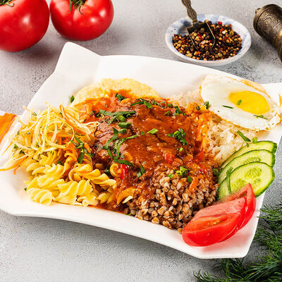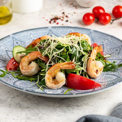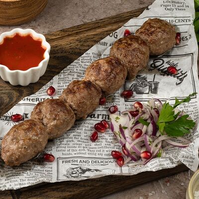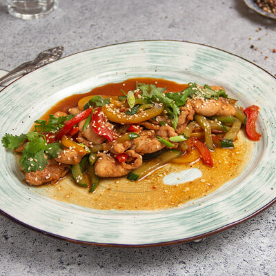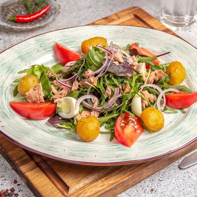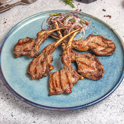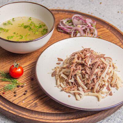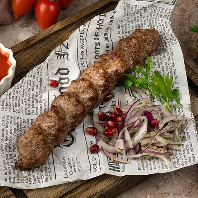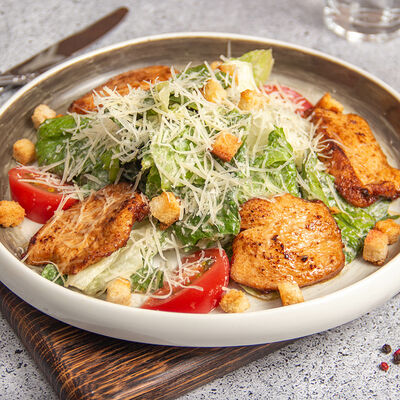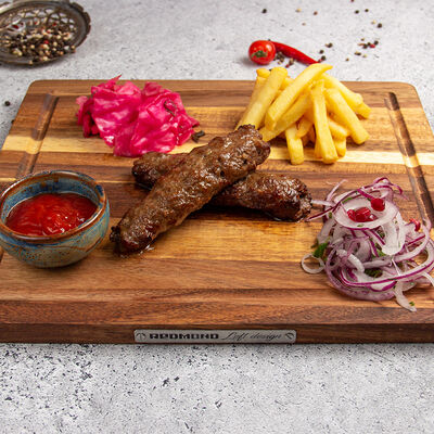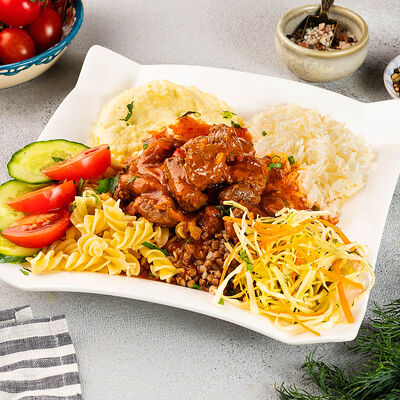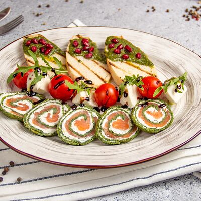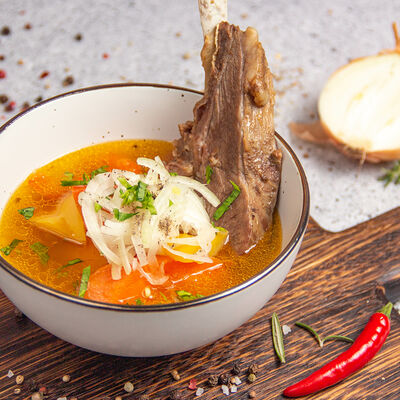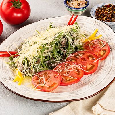 Сочный стейк из телятины, приготовленный на гриле. Подается с цукини, луком порей и томатами черри