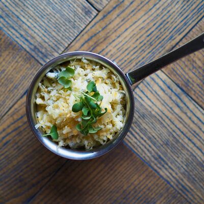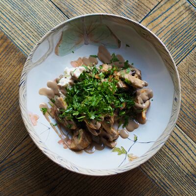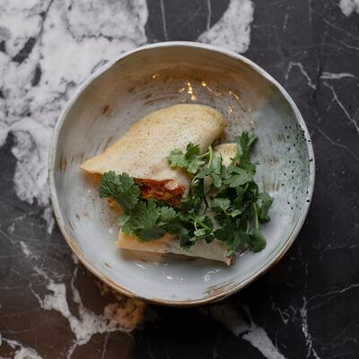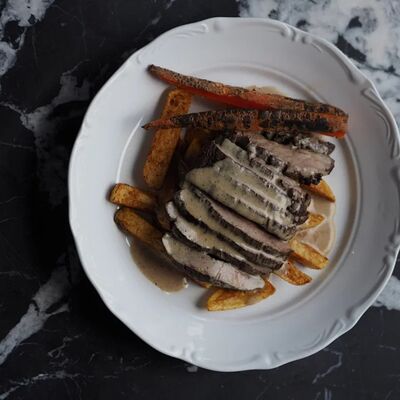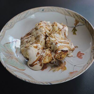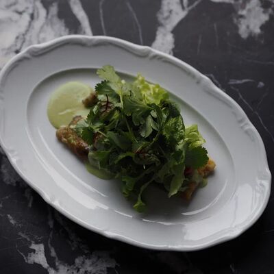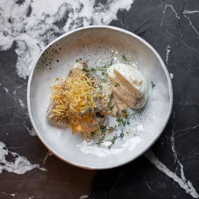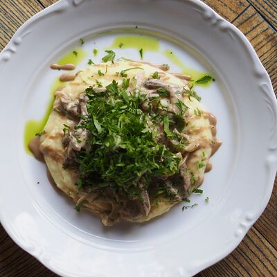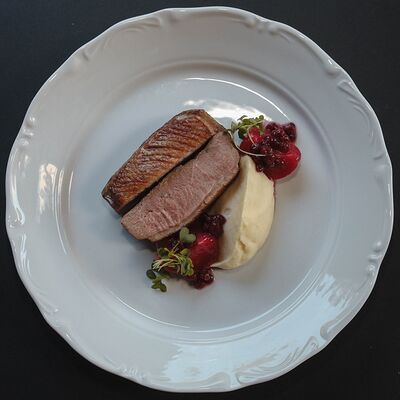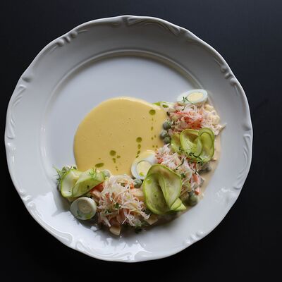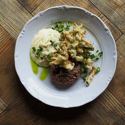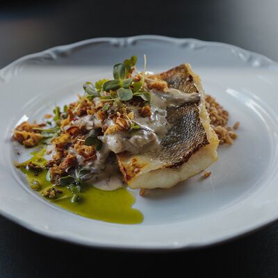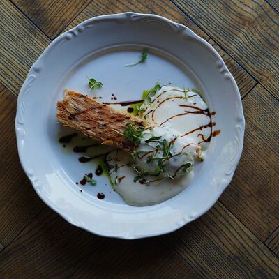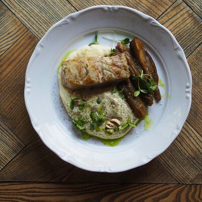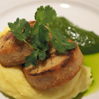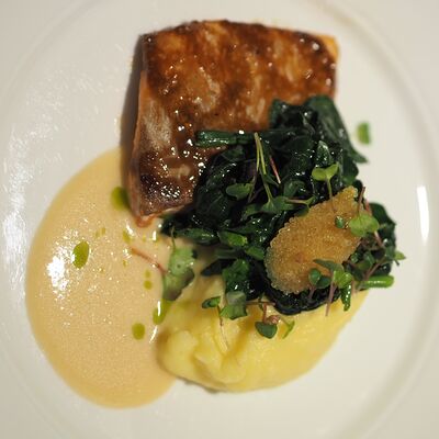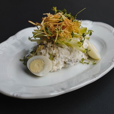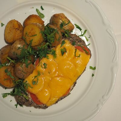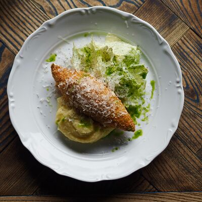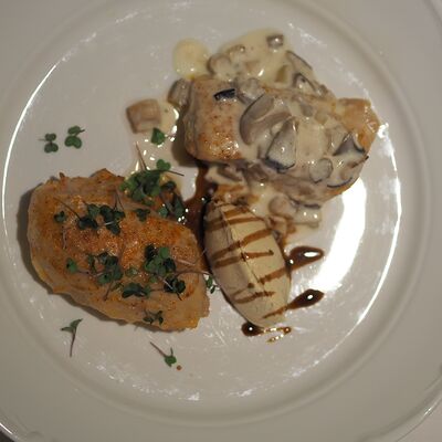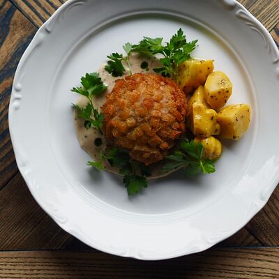 Котлета из филе судака в панировке панко с начинкой из вяленных томатов и эстрагона, подается с картофельным пюре, салатом айсберг и сырным соусом