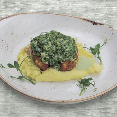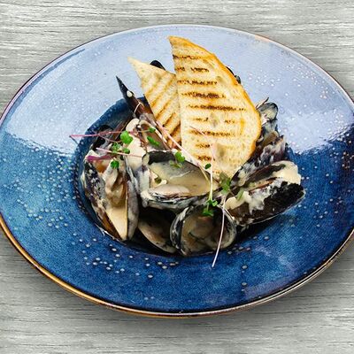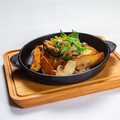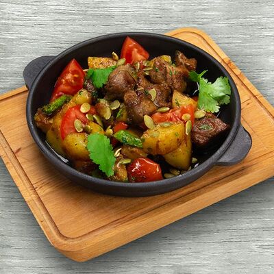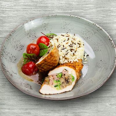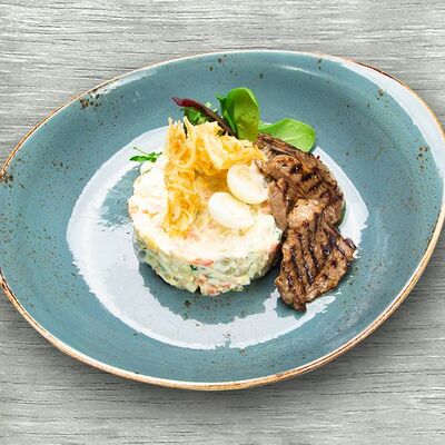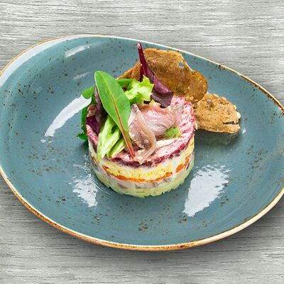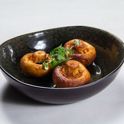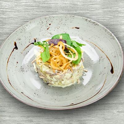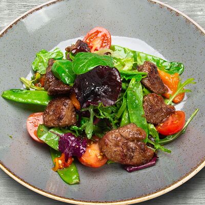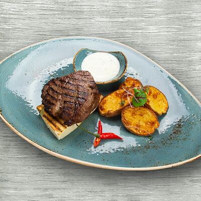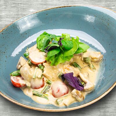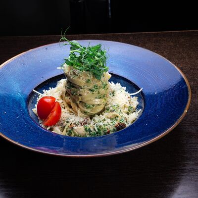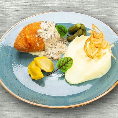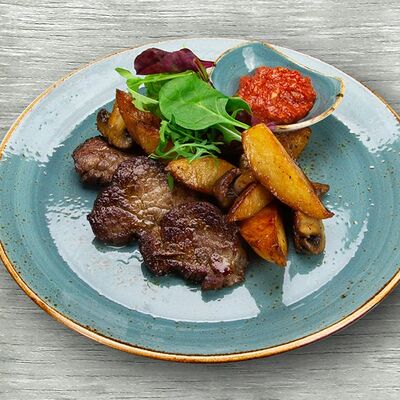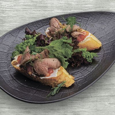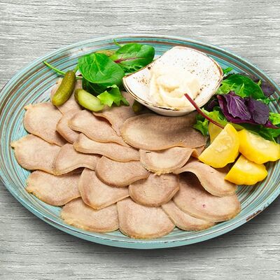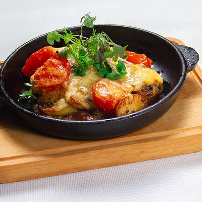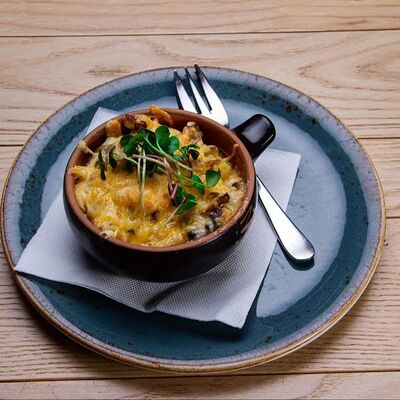 Язык говяжий томленое с грибами в сливочном соусе запечённое под корочкой из сливочного сыра